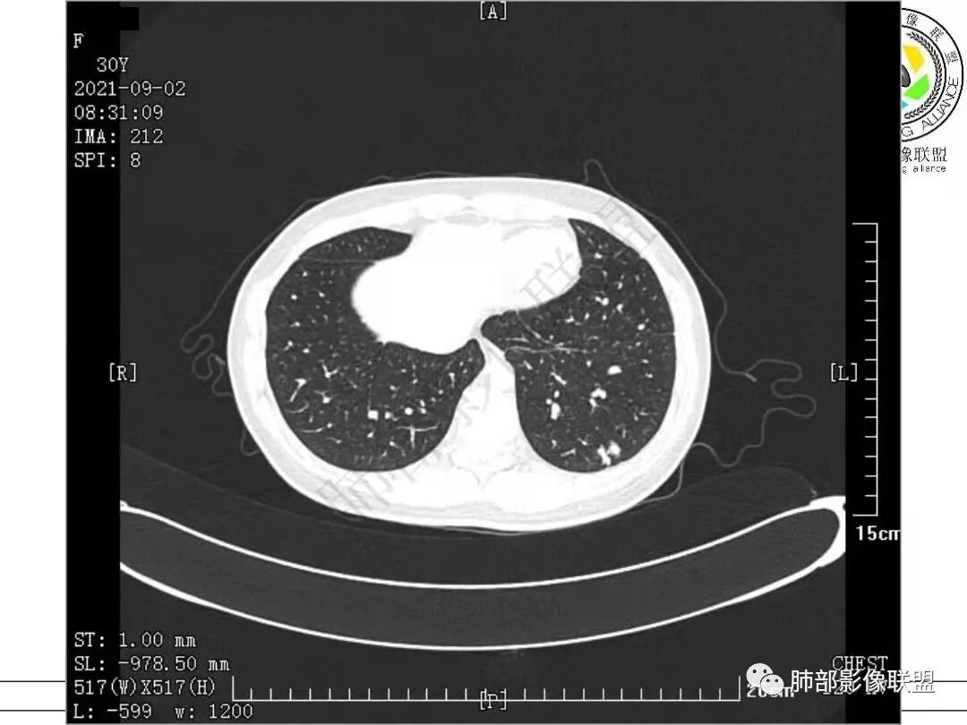 青年女性,左肺下叶胸膜下结节,似多结节融合,边缘毛躁,临近支气管管壁略厚,考虑炎性肉芽肿性病变