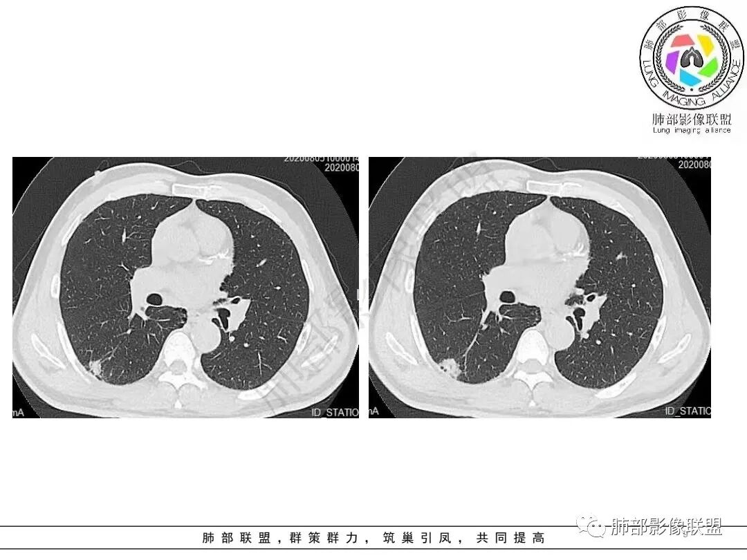 青年女性,咳嗽六个月,免疫正常。左肺下叶胸膜下结节、多病灶融合状,边缘平直,支气管部分进入,周围干净,考虑炎性病变,PC可能,鉴别腺