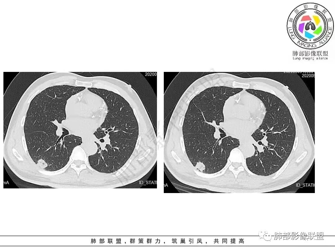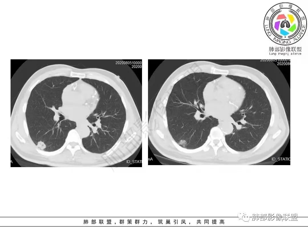 综合分析:两份病例都是位于胸膜下的孤立结节,同样具有锯齿状边缘,有细毛刺、空泡。病例一老年男性+CEA显著升高,常规恶性病变肯定是要考虑;至于病例二青年女性,肿瘤标志物阴性,在未见非常典型恶性征象情况下,临床通常会优先选择炎性病灶进行处置,病灶持续存在,复查无变化或出现进展,则应想到新生物可能,而选择穿刺或其他进一步检查。