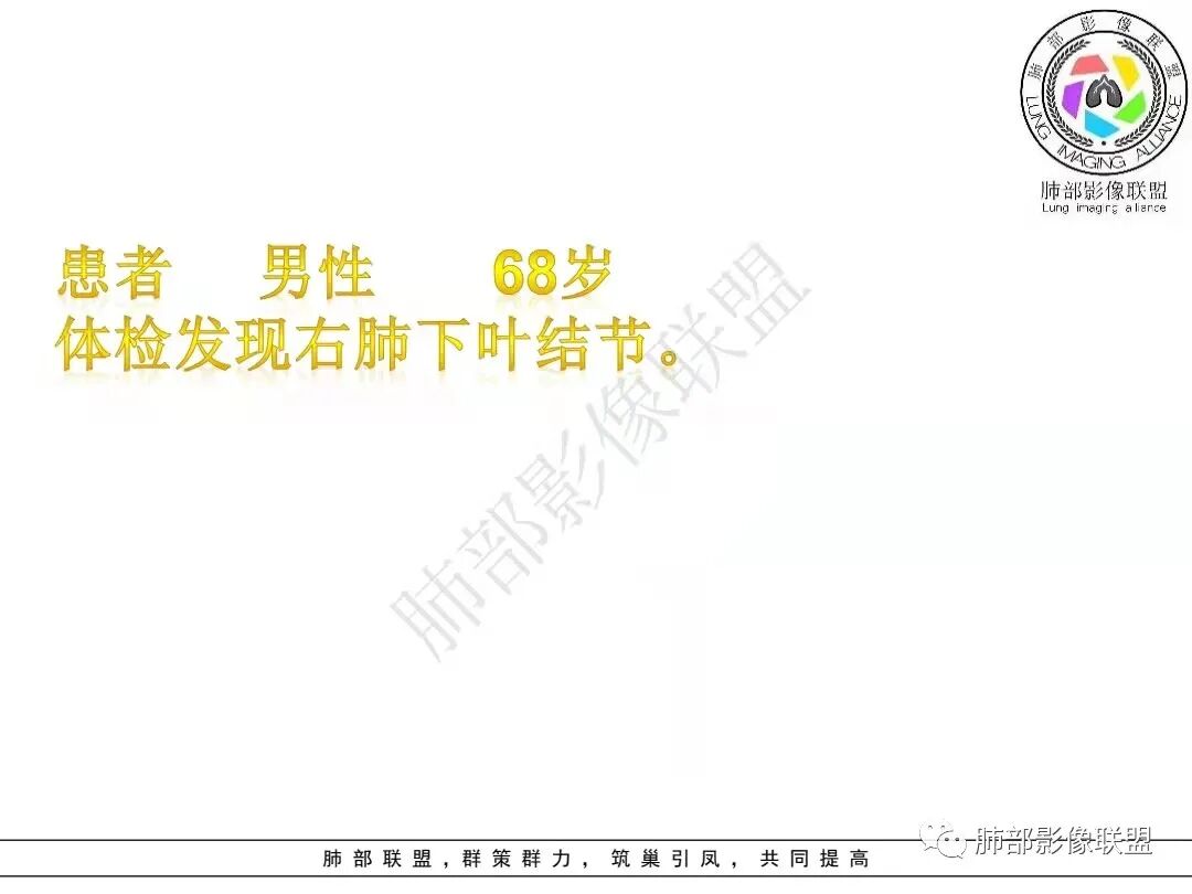 男,68岁,肿瘤标志物增高,右肺下叶胸膜下结节,边缘见毛刺、分叶及轻度空胸膜牵拉,病灶内见空泡影,轻度不均匀强化,考虑恶性病变,腺癌可能。