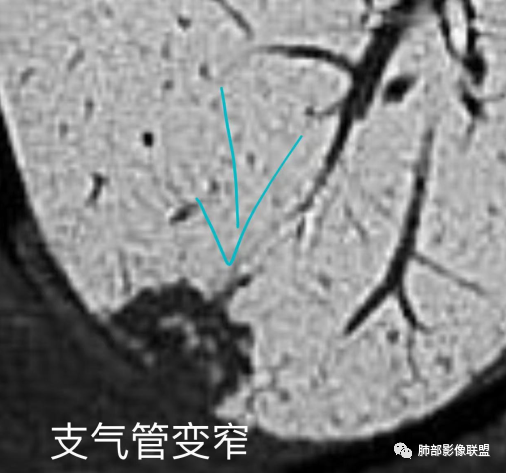 右肺下叶胸膜下结节影,有毛刺,支气管变窄截断,与胸膜之间有扯不清的关系,内部有空泡征。考虑腺癌