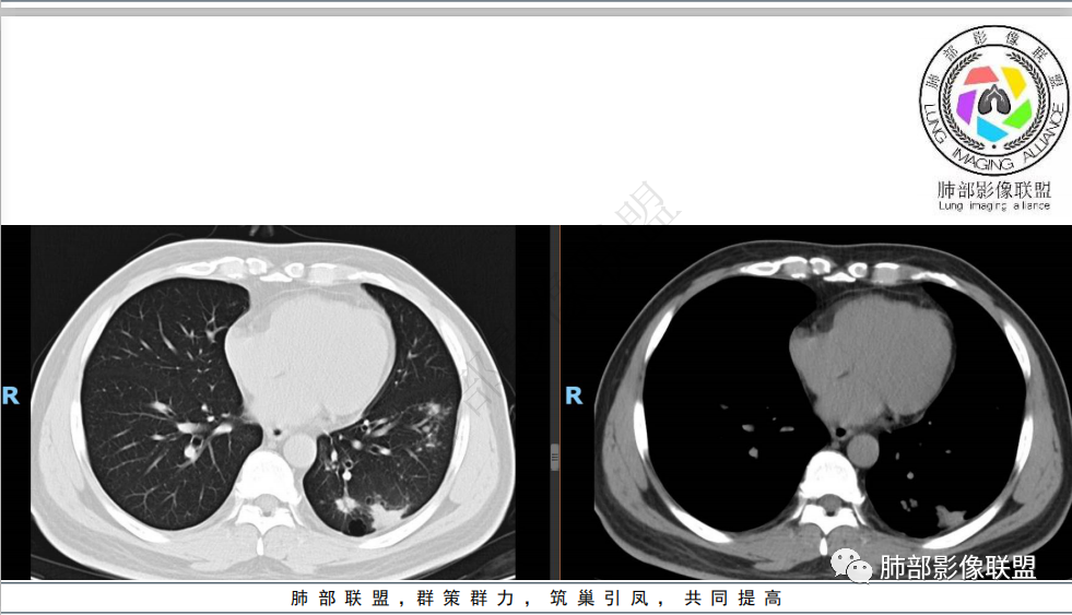 左肺下叶多发斑片结节,结节边界清楚,结节有堆聚感,似乎有树芽征,一元考虑结核,二元腺癌合并感染