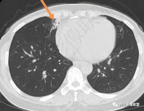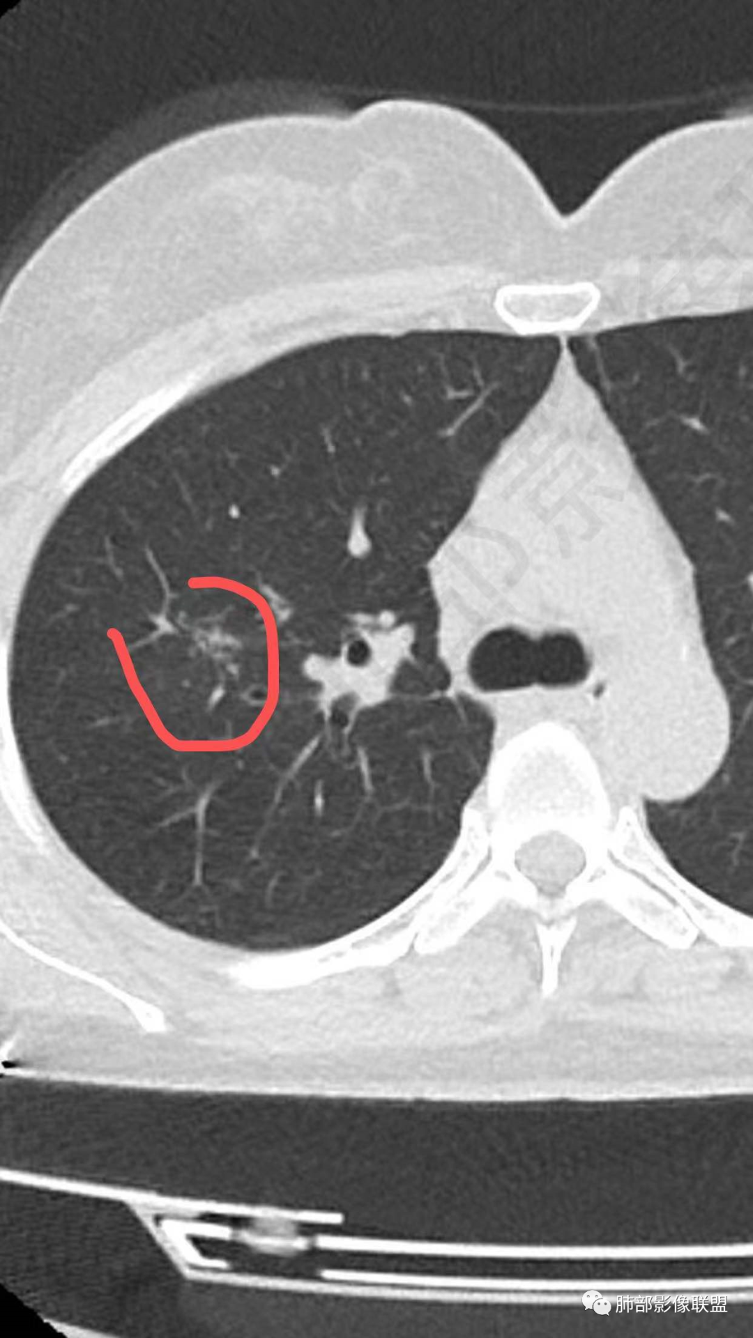 女,52岁,体检发现,右肺上叶尖段混合磨玻璃密度影,形态不规则,内部支气管血管穿行,胸膜牵拉,远侧端可见卫星灶,考虑结核