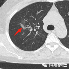 磨玻璃结节,边缘清晰,索条,外缘小结节,考虑结核,鉴别腺癌。