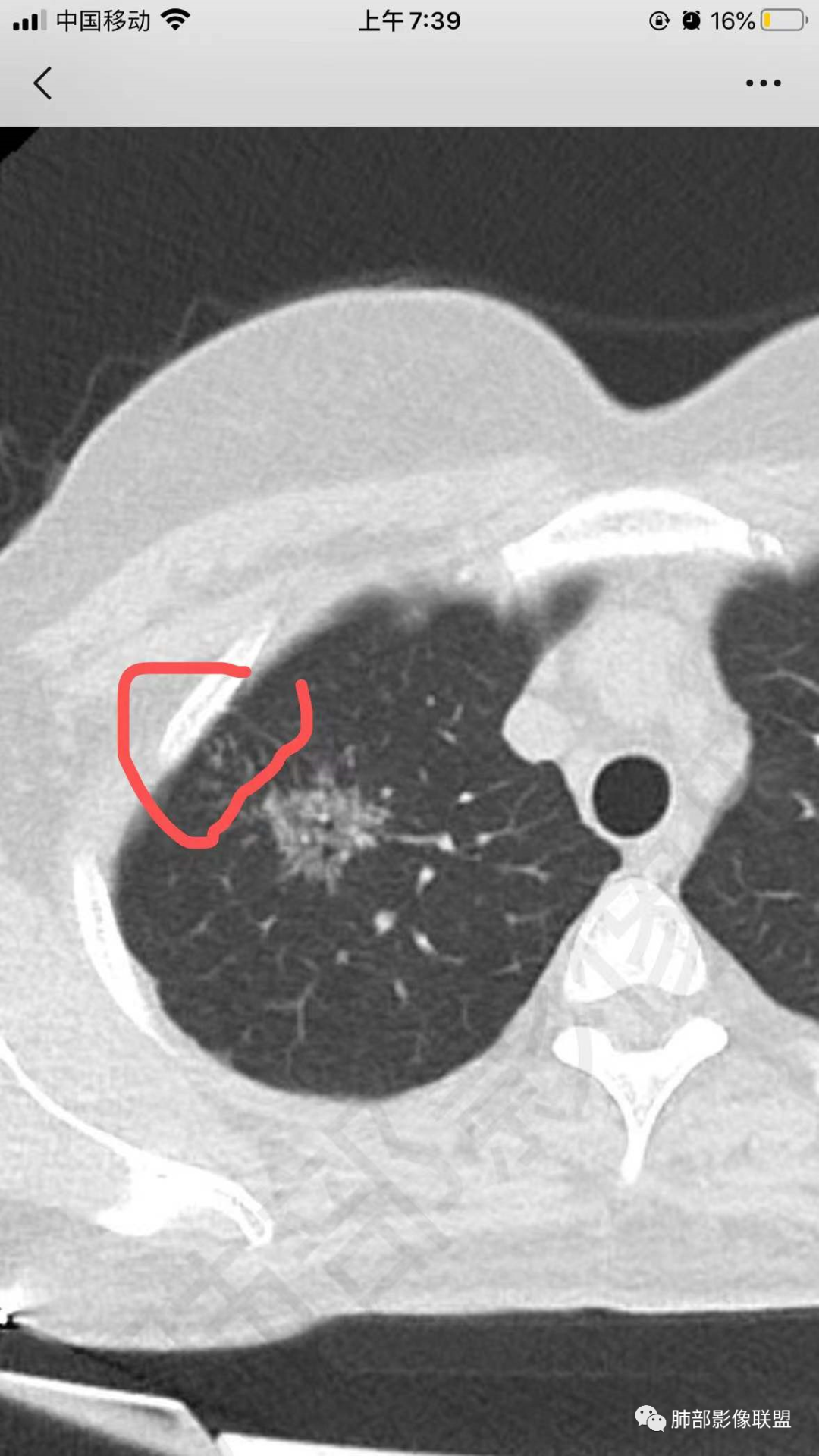 右肺尖磨玻璃结节,边界不清,有长软毛刺,邻近肺野似可见播散灶,病史不详,结节松散,考虑炎性肉芽肿性结节,首选TB,鉴别腺癌