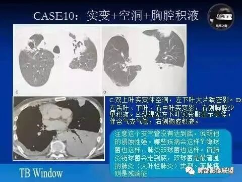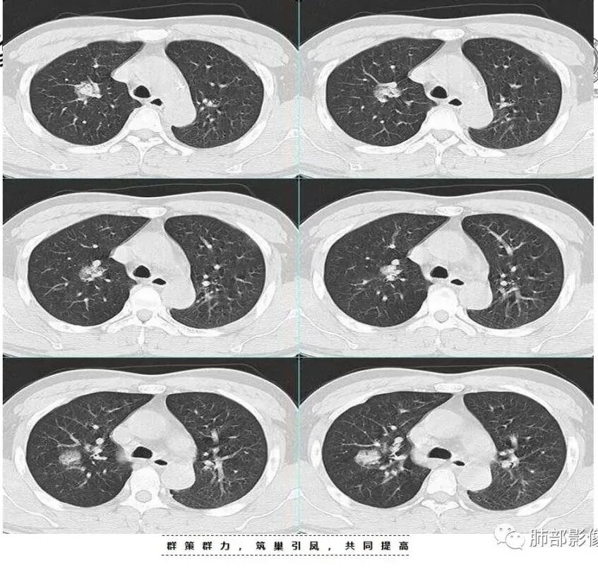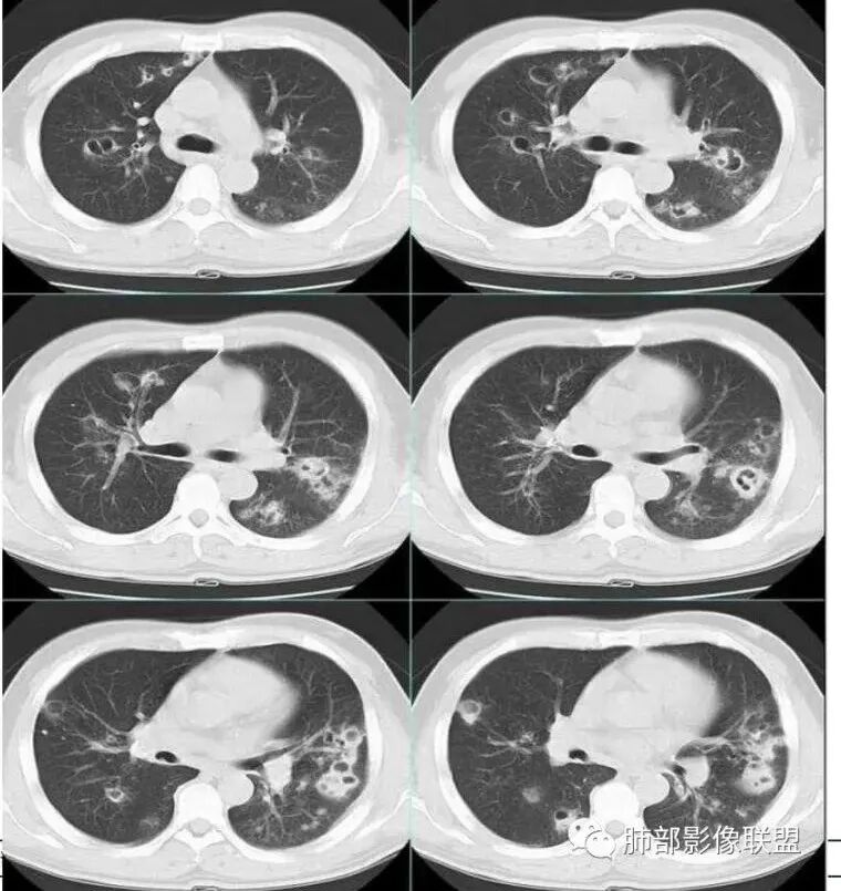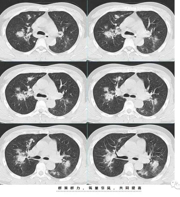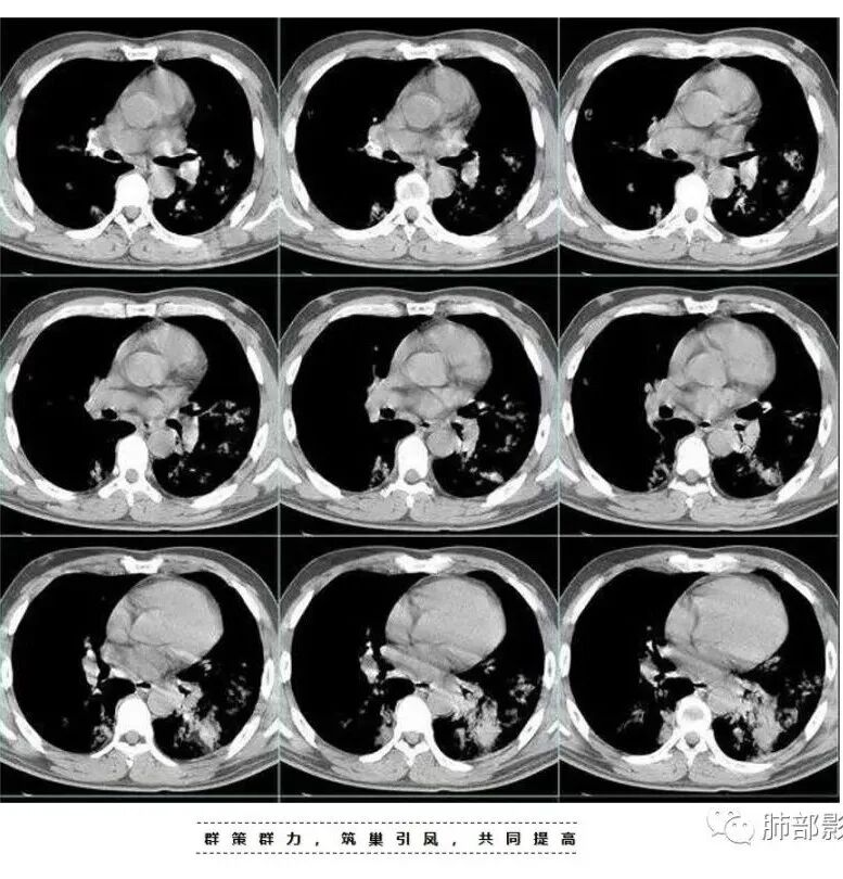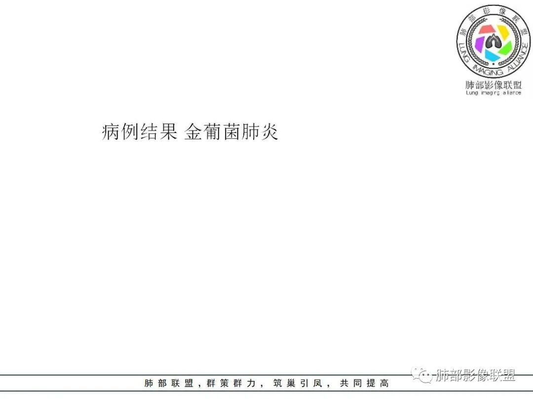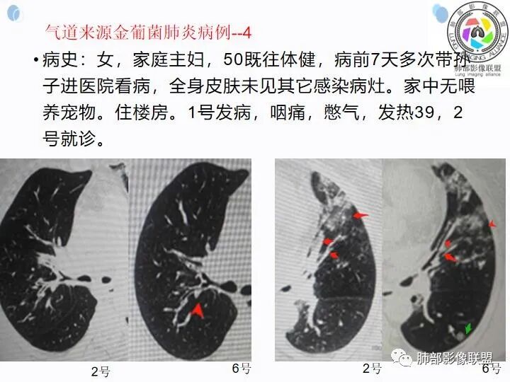 因为我看过一篇吴婧及南边老师分析的气道吸入型金葡菌肺炎觉得很像 还有就是这个分布我不考虑粘液腺癌 王兆宇老师说过 粘液腺癌先是周围型开始 我觉得主病灶应该是从外围胸膜下向内蔓延+播散