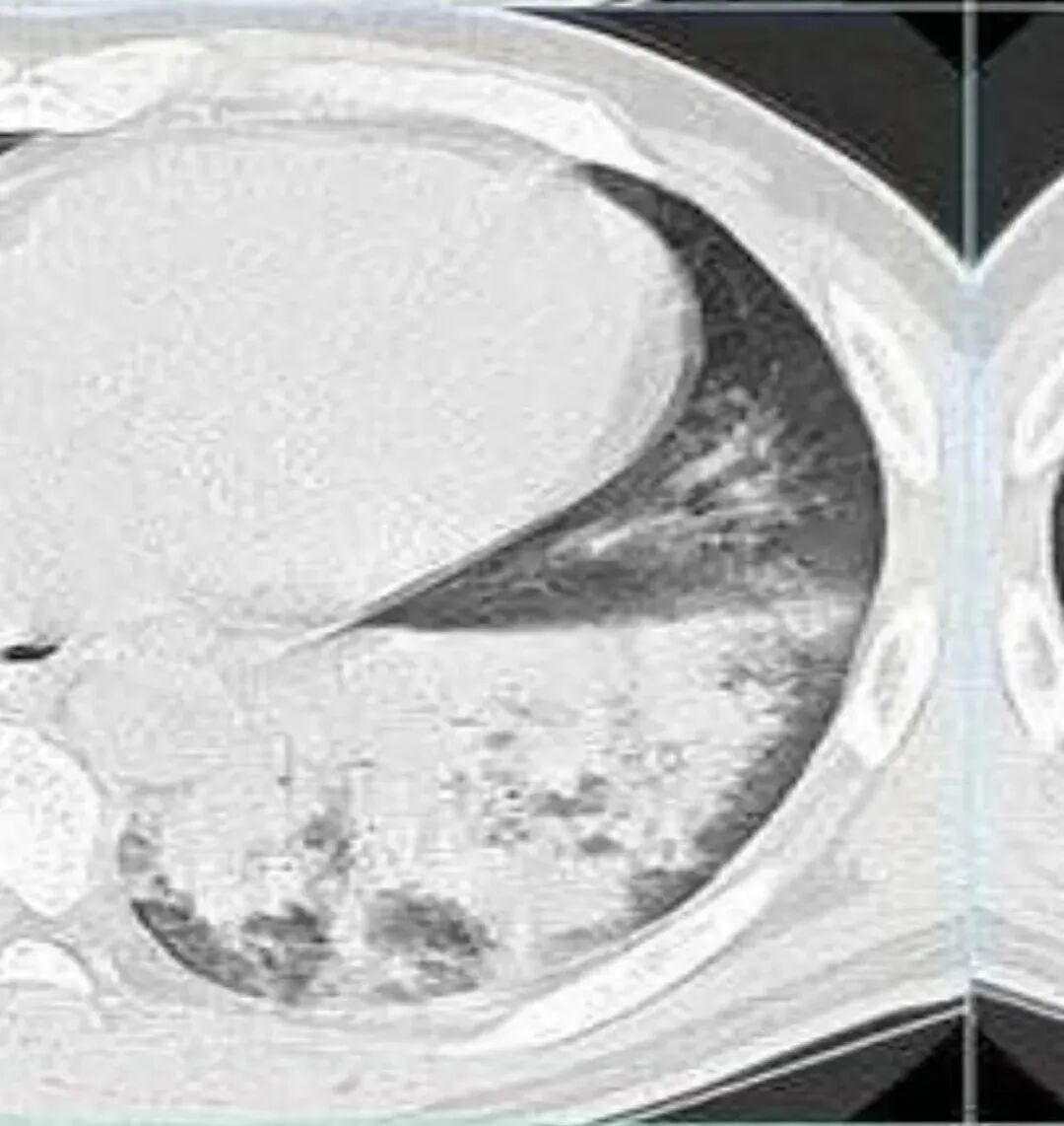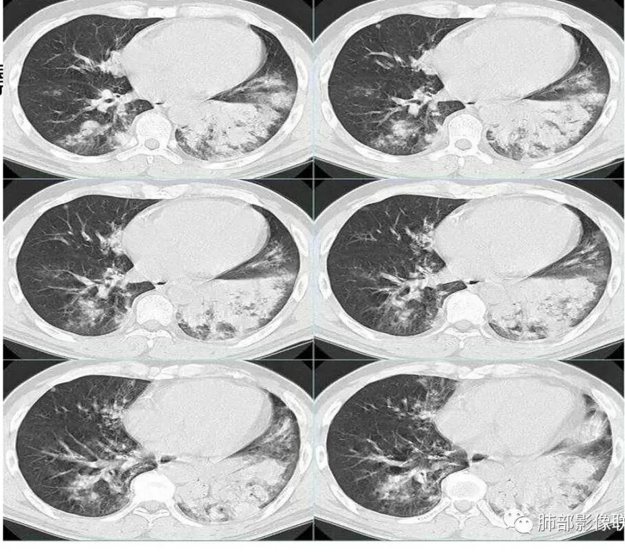 中年男性,两肺多发磨玻璃及实变影,边缘模糊,左下肺病灶部分边缘平直,双侧胸腔未见明显积液。考虑感染性病变
