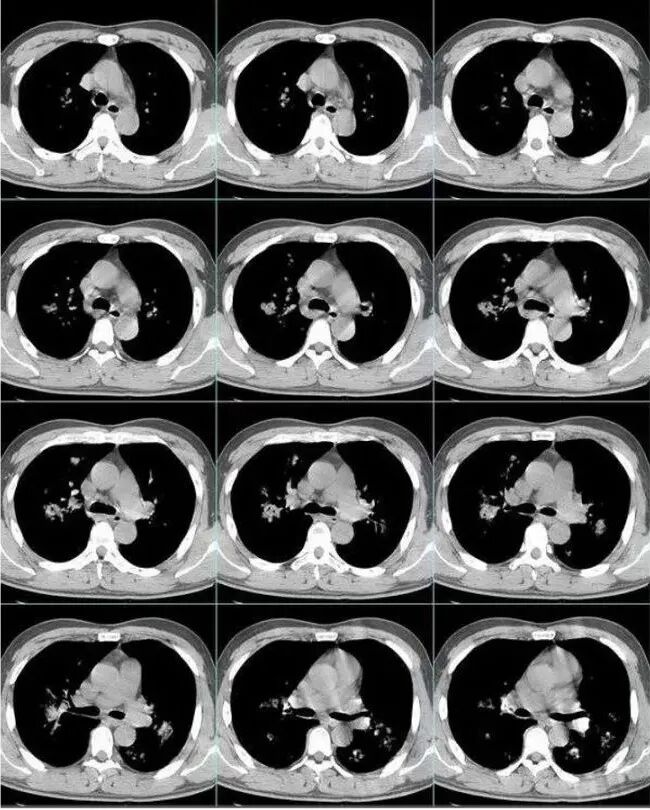 两肺支气管血管束分布实变,结节,部分似磨玻璃,细网格,支气管穿行。考虑1.血管炎。2.新冠少见模式。鉴别肺癌,结核,鹦鹉等