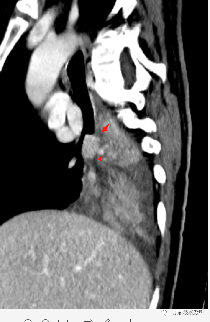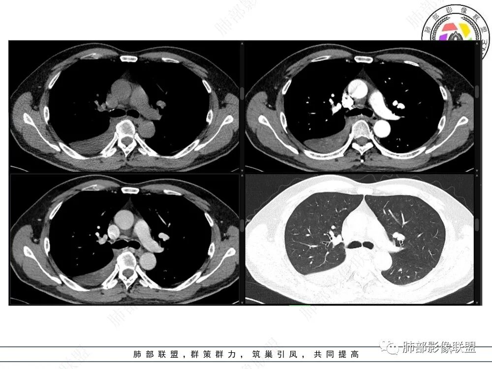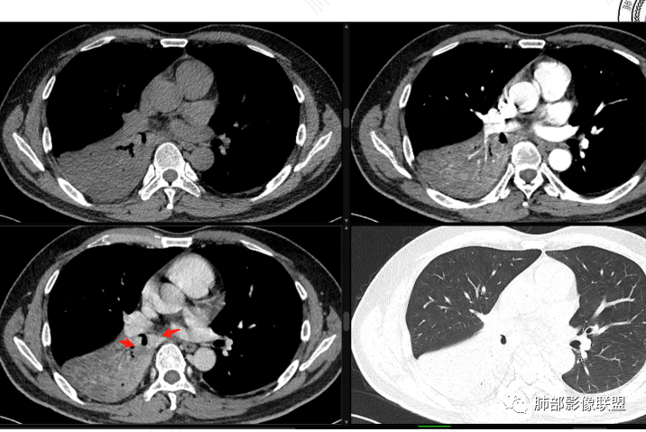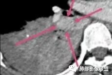 首先血管未见明显侵犯、移位,提示病灶:炎性;肿瘤:外朝内——含粘液类腺癌(肺门淋巴结转移),腔内肿瘤(鳞癌、腺癌、类癌、小细胞、粘液表皮等)