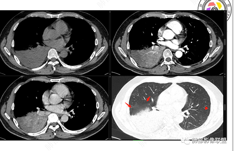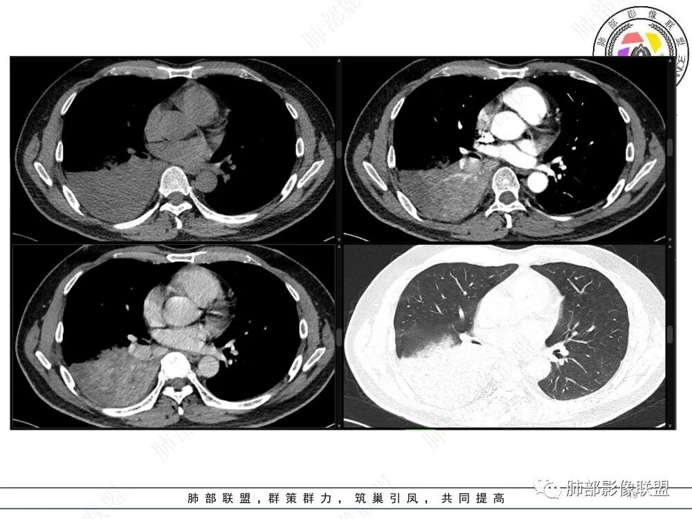 右肺下叶大片实变,密度不均匀,可见支气管充气征及粘液区,右肺下叶支气管内结节影,下叶支气管阻塞,病灶前下可见磨玻璃影,右侧积液,考虑粘液腺癌,鉴别类癌?