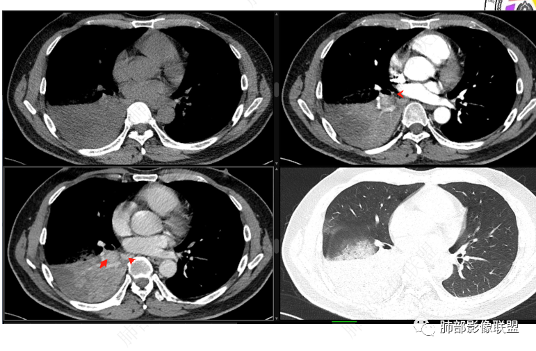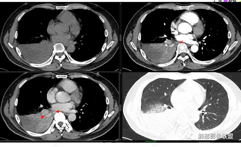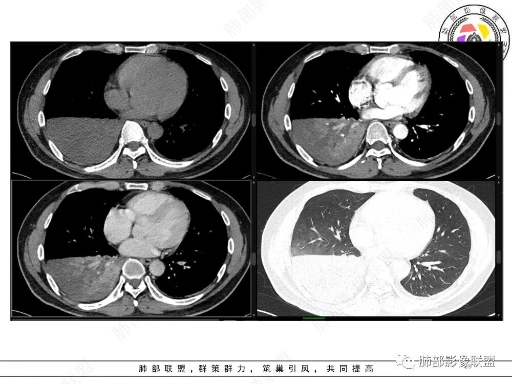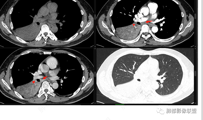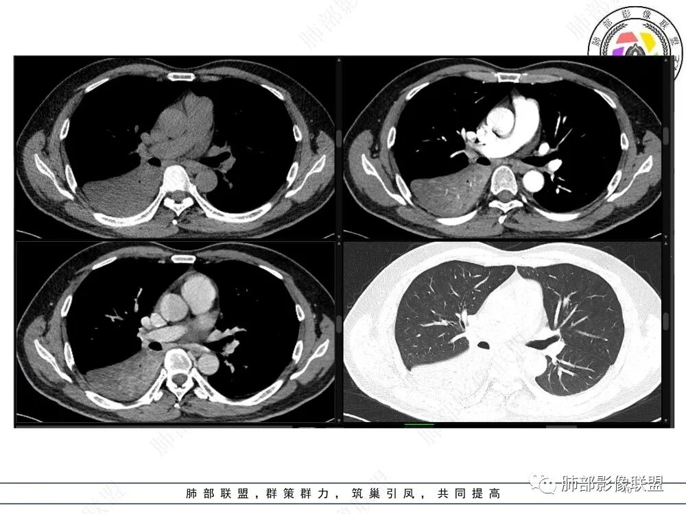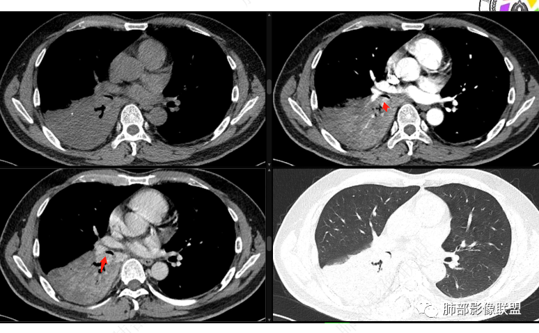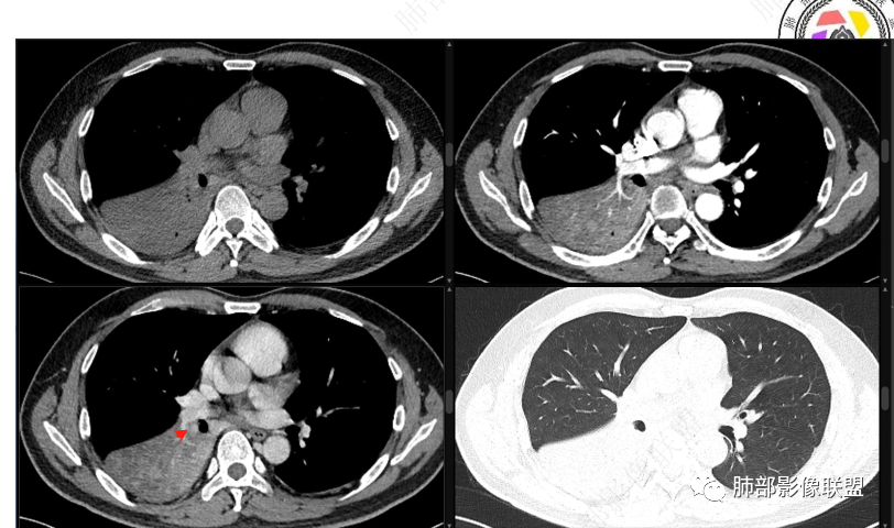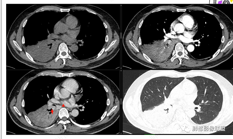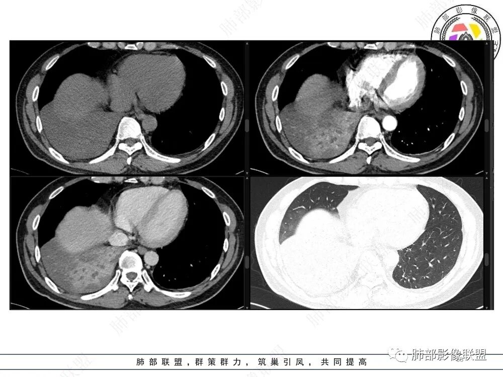右肺下叶实变,周围磨玻璃,近端支气管扩张,管壁凹凸不平,远端阻塞,可见粘液栓,不均匀强化,有低密度无强化影,其内血管显示尚可,考虑粘液腺癌,鉴别淋巴瘤