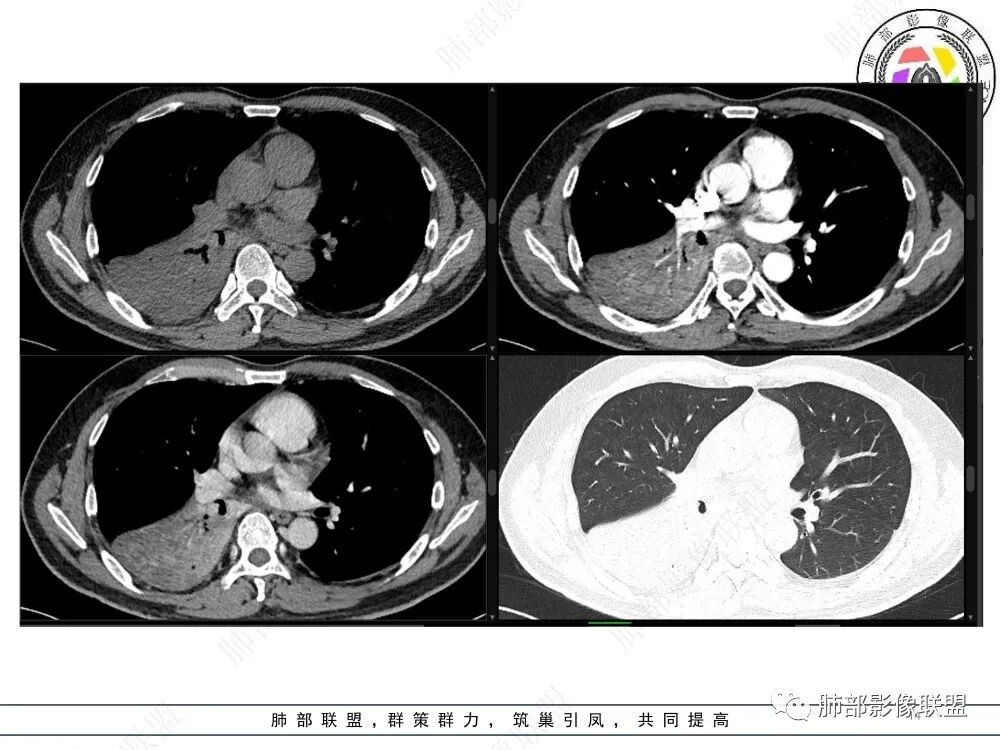 中央型肿瘤pk周围型肿瘤 。壮年男性,热咳一周伴气喘,中性白细胞升高,临床是个感染过程。支持中央型病变的证据:1 肺门明显强化结节 2 横s征 3 支气管粘液栓 4 主支气管变窄,似见冰山征 支持周围型病变:1 按叶段塑形 2 血管造影征 3 病灶内弥漫高强化 4 周围伴磨玻璃灶,但境界不清继发感染?误吸?综合 中央型肿瘤可能大:类癌》鳞癌