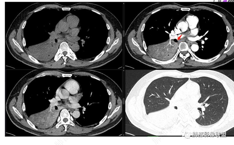 右肺下叶阻塞性肺不张,粘液栓,边缘磨玻璃影,良性,谈栓,异物,恶,鳞,腺癌,类癌,男性,46岁,病程不长,似乎有强化,选类癌。