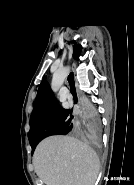 中心性起源:主要位于段及段以上支气管,多为气管、支气管腔内软组织结节及肿块,卵圆形或分叶状,沿支气管壁生长,最长径与支气管走行长径平行,与近心端支气管管腔呈钝角,支气管内可见“空气新月征”。