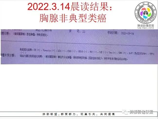 很多老师提到前纵隔占位+血管肿块内漂浮+内乳淋巴结增大+轻中度强化=淋巴瘤,淋巴瘤确有上述特点,但本例血管漂浮不明确,病灶强化不均匀,胸椎及肋骨可疑增生性转移,应想到胸腺癌或不典型类癌的可能性。