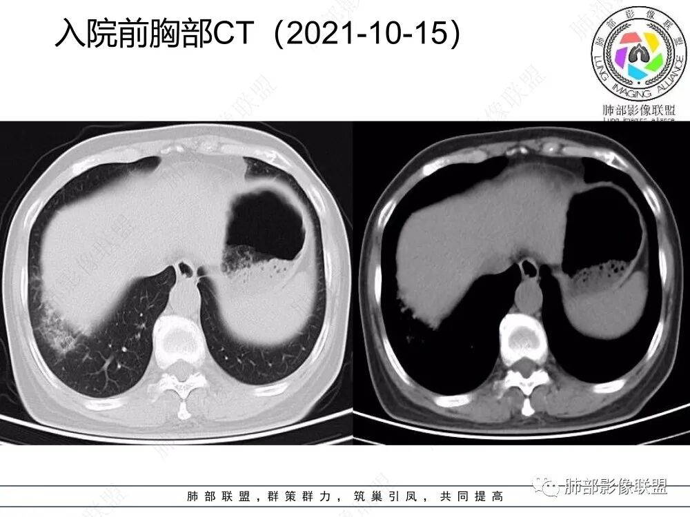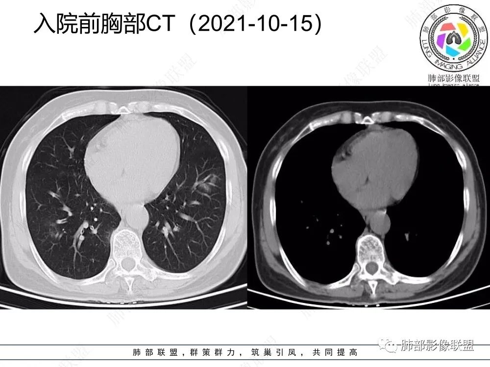 2、CT表现为两肺下叶结节影、斑片影、磨玻璃影,沿支气管血管束分布,部分支气管壁显示增厚。粗略一看部分病灶内似可见“细网格影”,但是仔细观察,可发现此“细网格影”不同于我们常见的“细网格影”,尤其是右肺下叶病灶,可以观察到病灶内部的网格上有高密度结节感或颗粒感,部分层面见“反晕征”,且反晕的边缘亦可观察到结节感。未见胸腔积液。