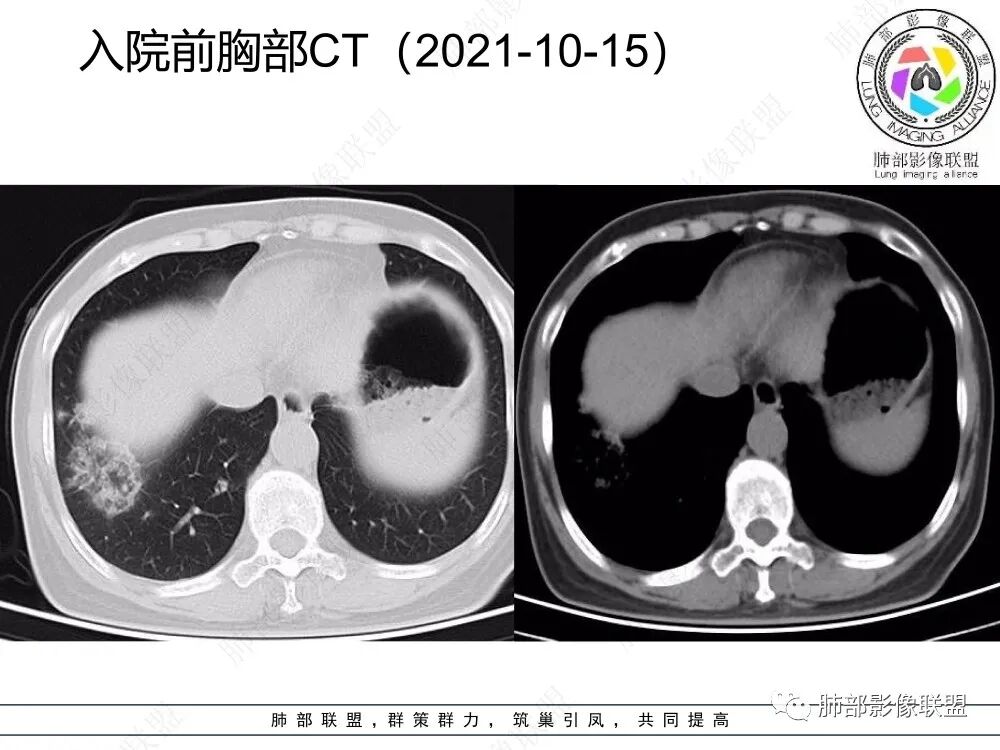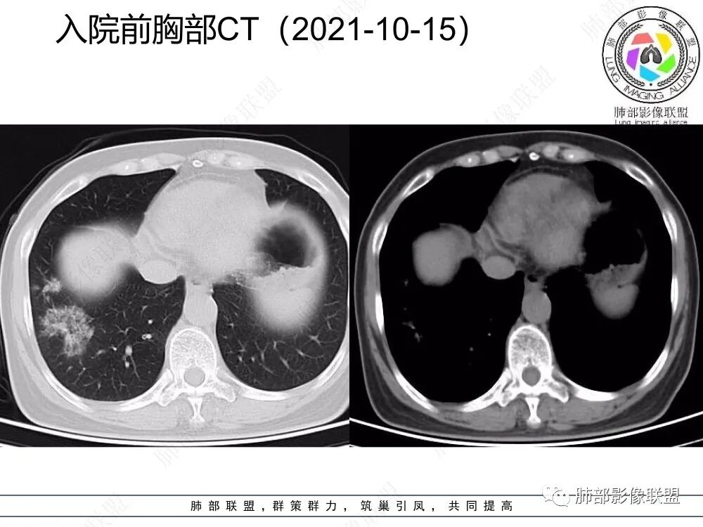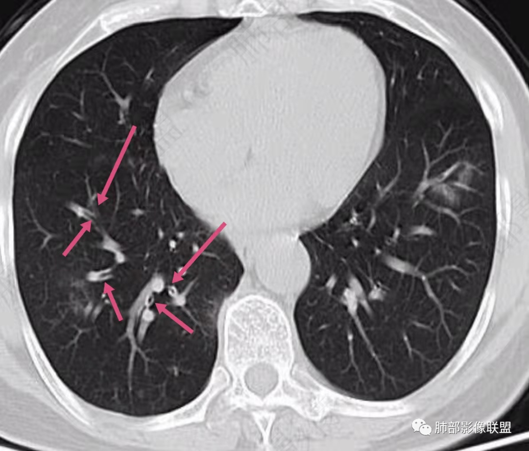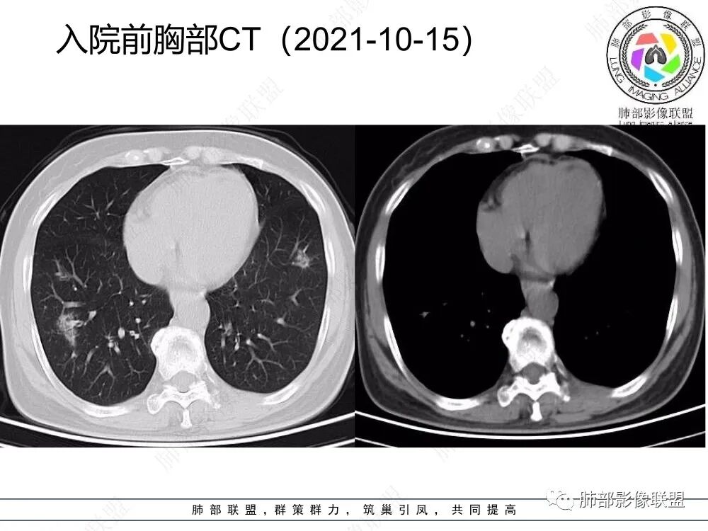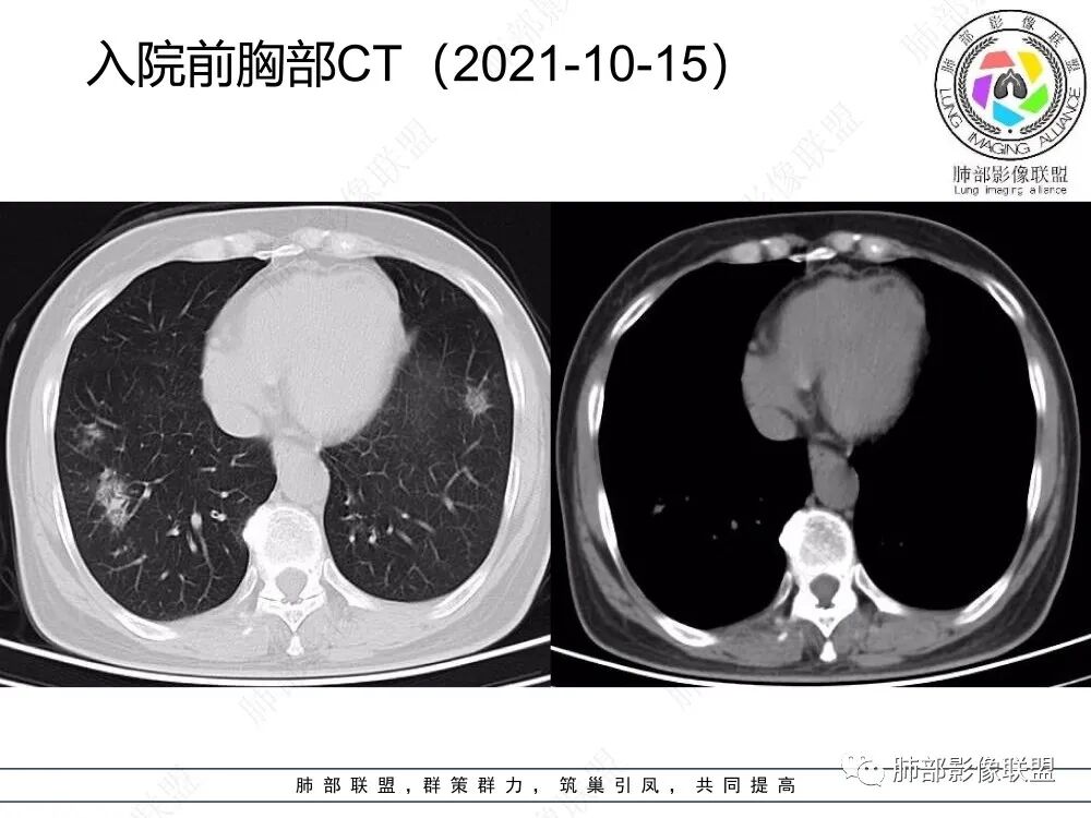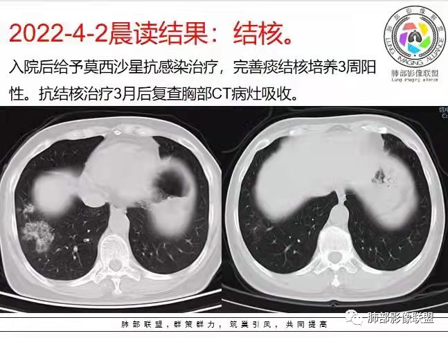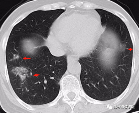 本例病变以两肺下叶为主,非结核好发部位,通常会想到感染性病变,右肺下叶病灶高密度结节感、反晕征,较为符合继发性肺结核(间质浸润为主),但双肺散落的相对柔和淡薄小片影给诊断带来困惑。