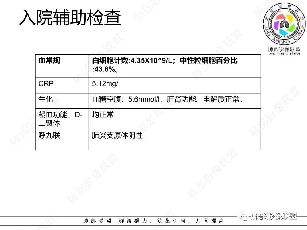 蔡磊:老年女性,急性病史。白细胞不高,CRP轻度升高。入院中性粒细胞、白细胞不高,常规抗炎效果不佳 。双肺下叶多发散在斑片样磨玻璃影,边缘较清,小叶内间隔增厚,结合临床实验室,考虑感染性病变,病毒性肺炎。