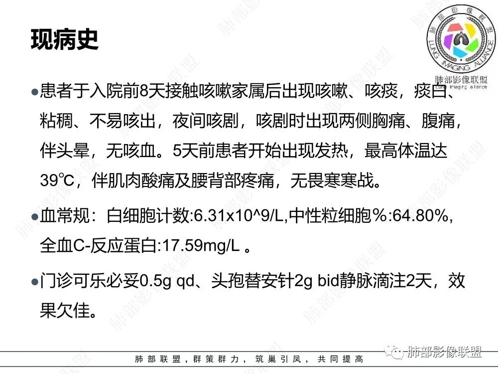 流心明智:女,咳嗽、咳痰8天,发热5天,伴肌肉酸痛,接触咳嗽患者后发病。血像正常。胸部CT:两肺多发斑片样GGO,外带分布,长轴沿胸膜展开,小叶内间隔增厚,右下斑片灶反晕?考虑不典型病原体,鹦鹉热?病毒?鉴别TB、支原体等。