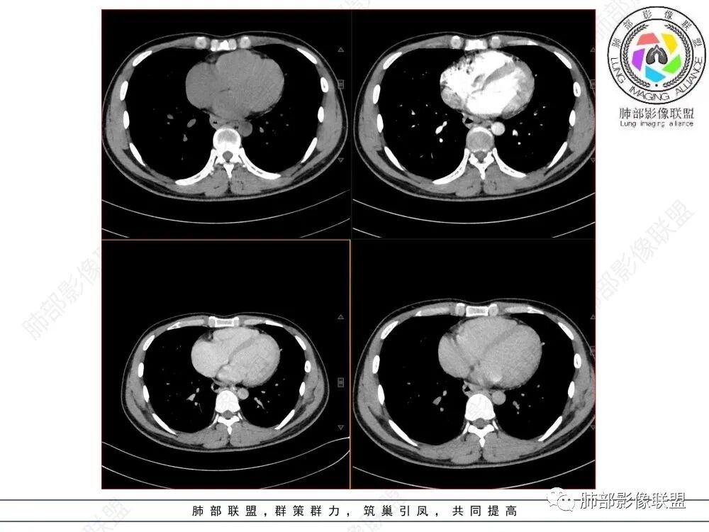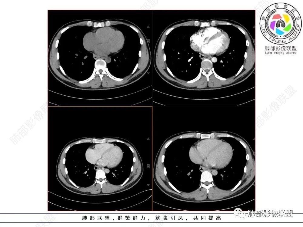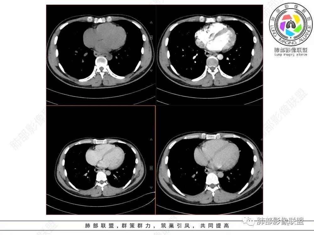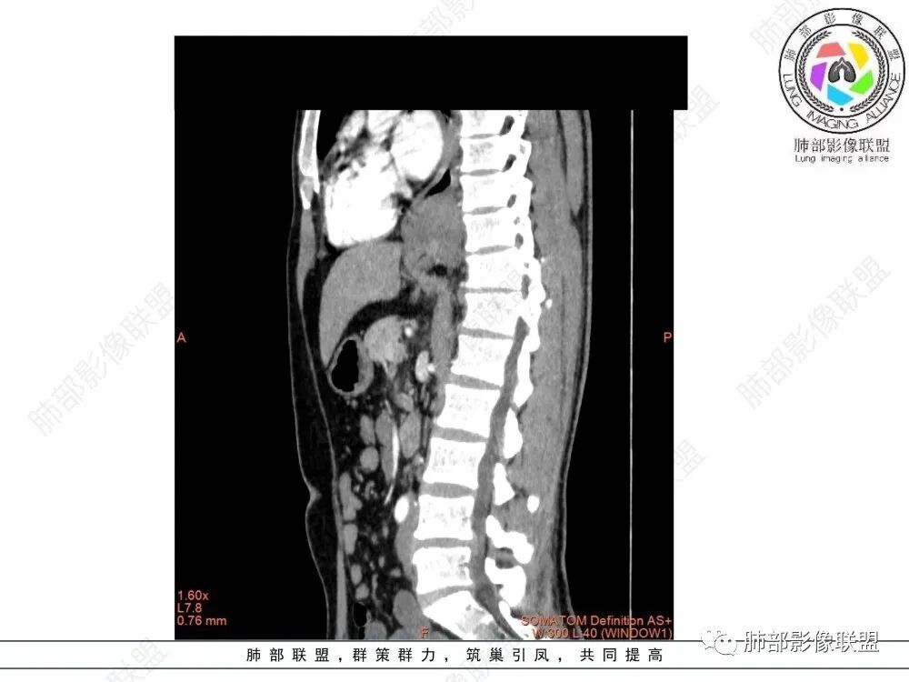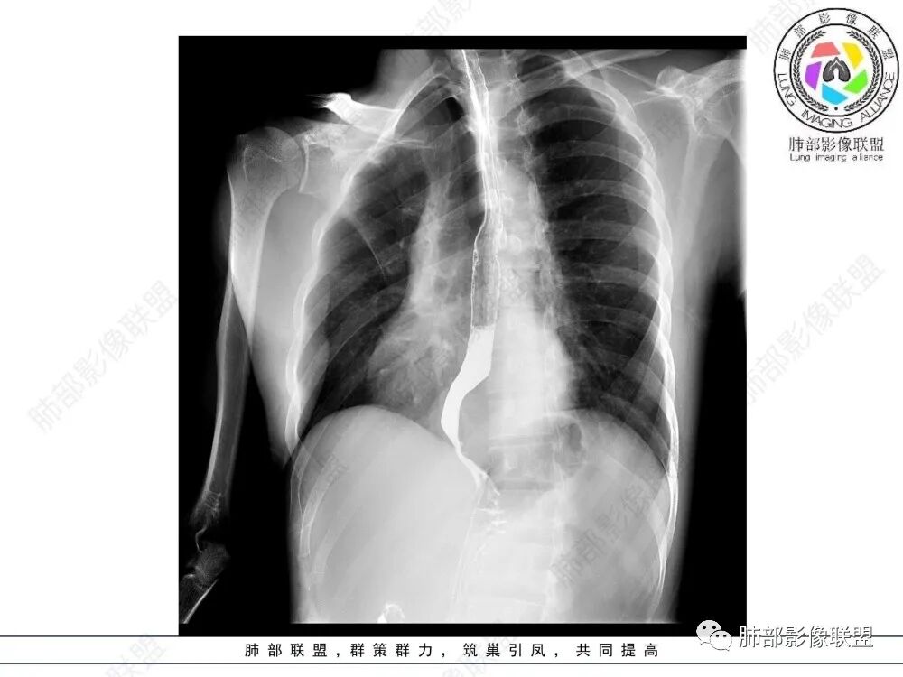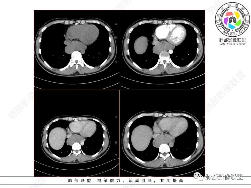 影像学特点:类纵隔区病变,沿食管生长,形态不规则,但边界清楚,内部信号/密度均匀,强化程度比较弱。