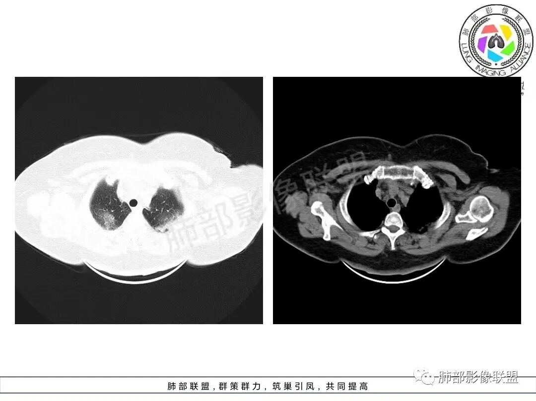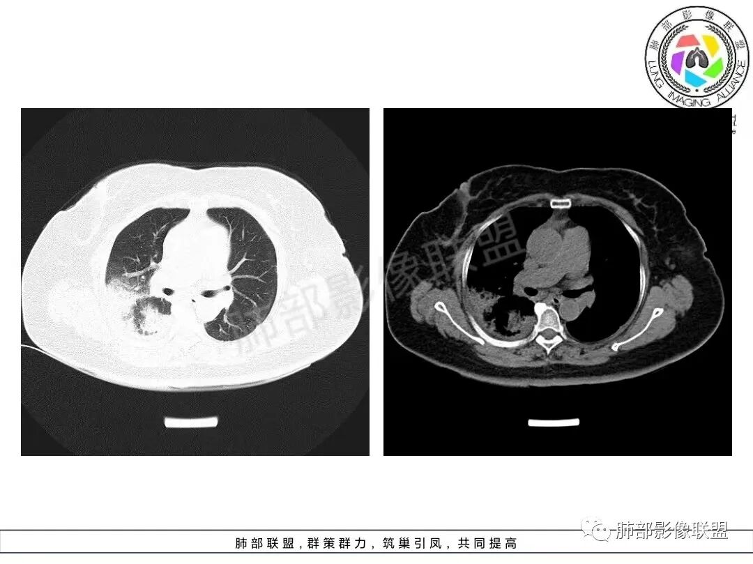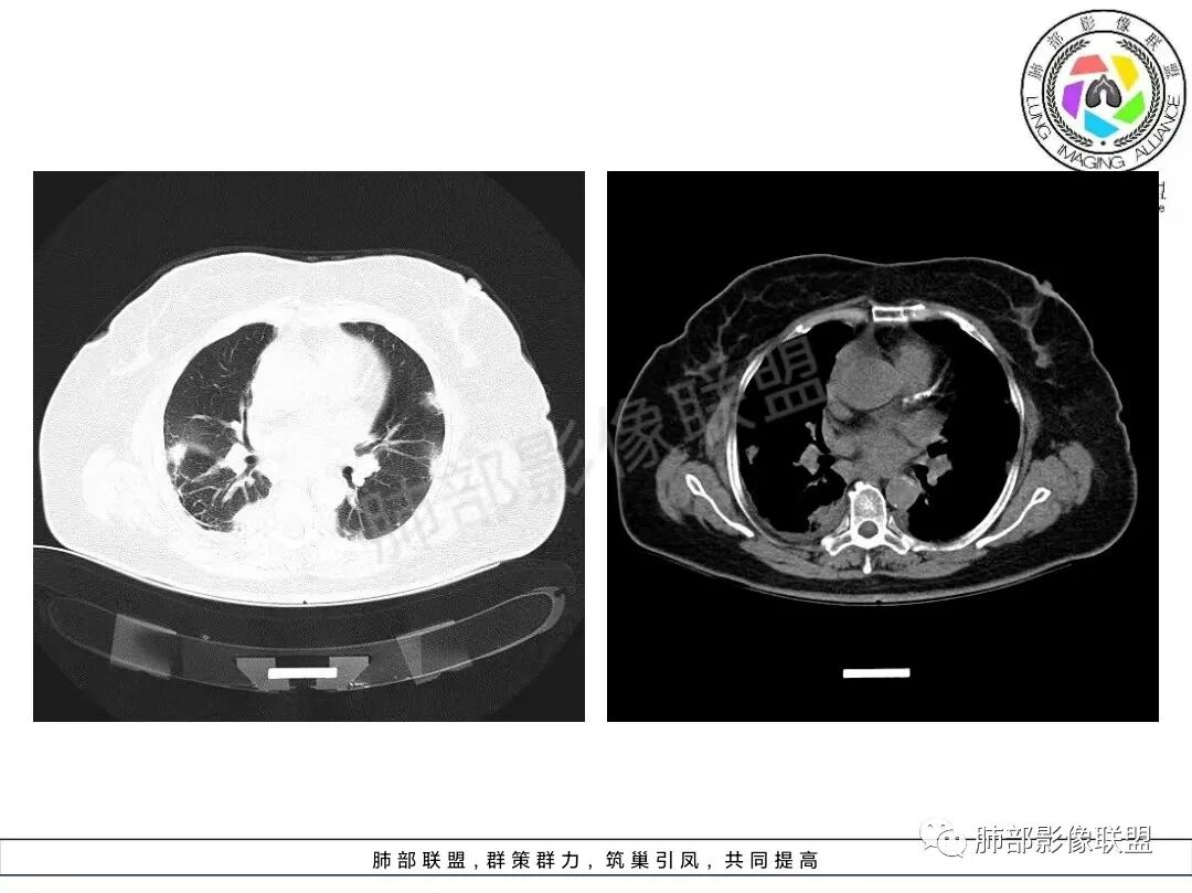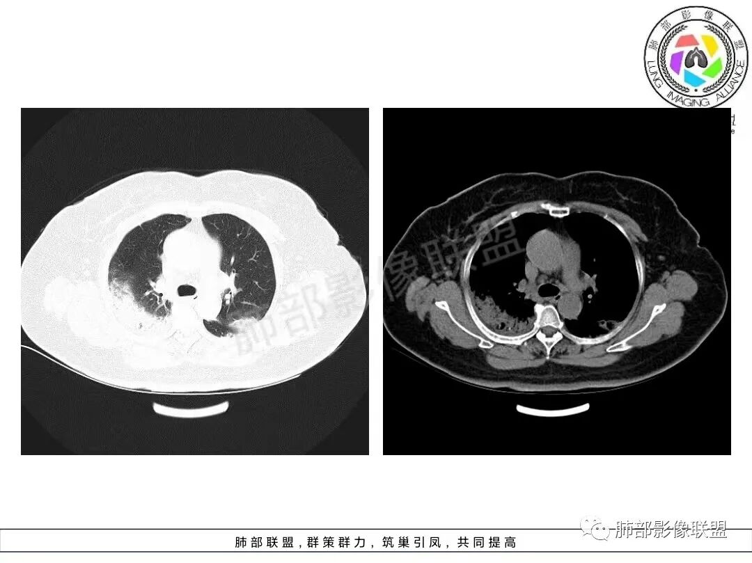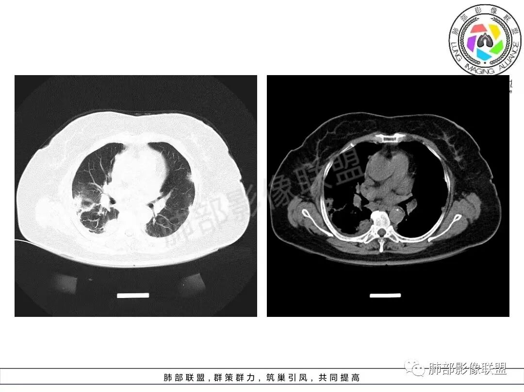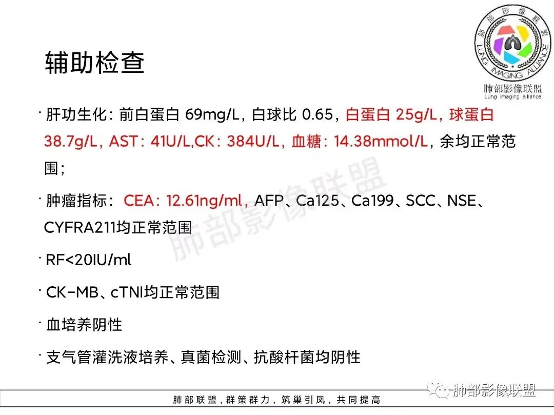 1、临床特点:70岁女性,务农。咳嗽咳痰伴气急20天。症状逐渐加重。有高血压病史。入院查体:体温37.5℃,急性面容。白细胞、CRP、红细胞沉降率升高。血糖高,CEA升高、余肿瘤标志物正常。ANCA检查阴性。血培养阴性,支气管灌洗液培养、真菌检测、抗酸杆菌均阴性。