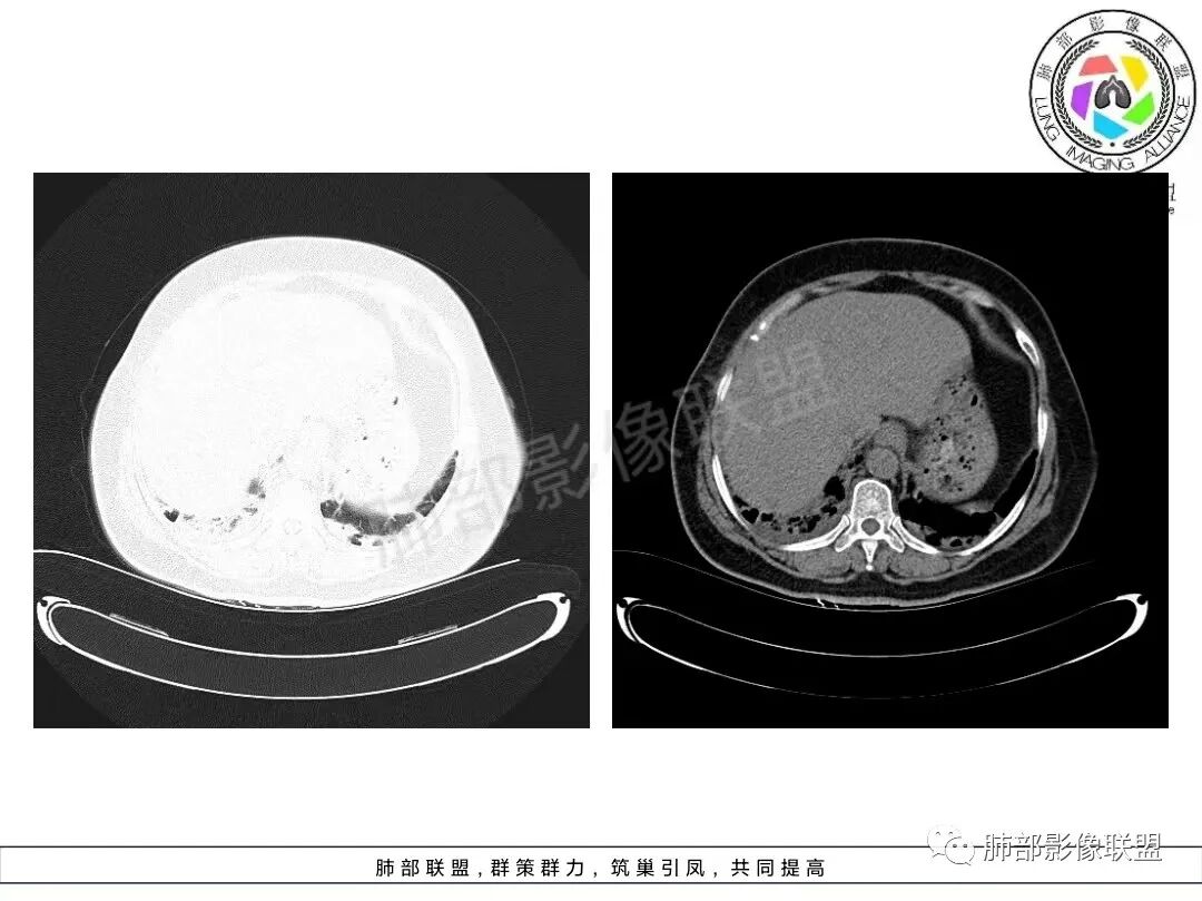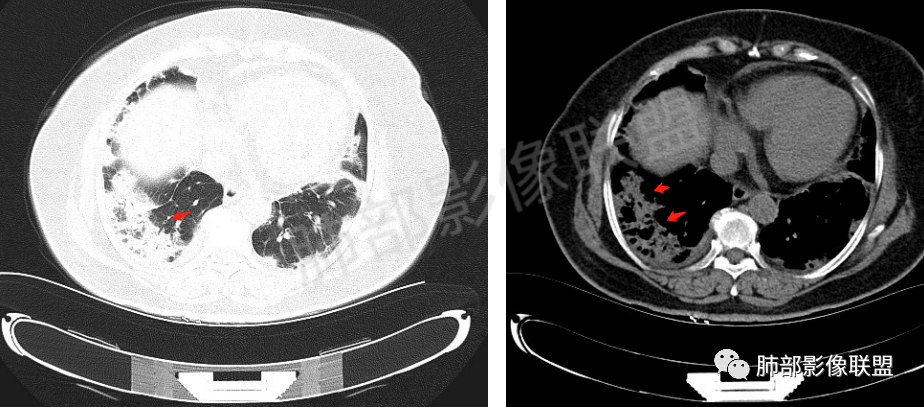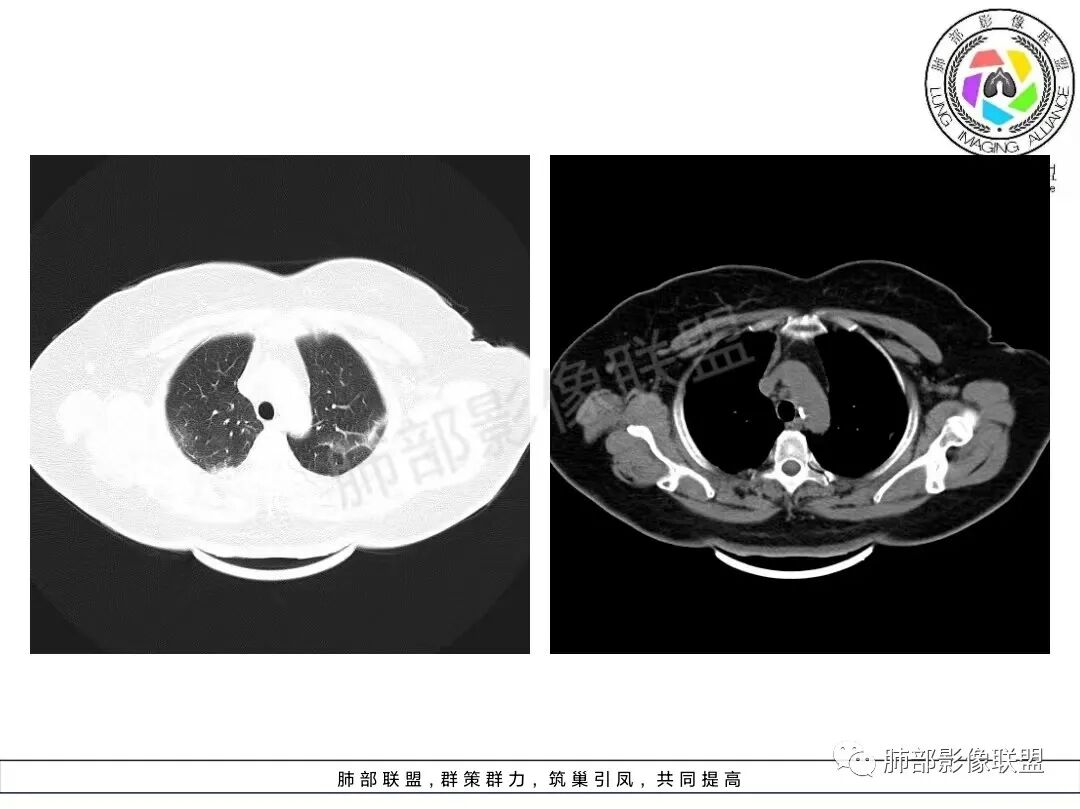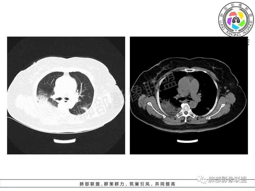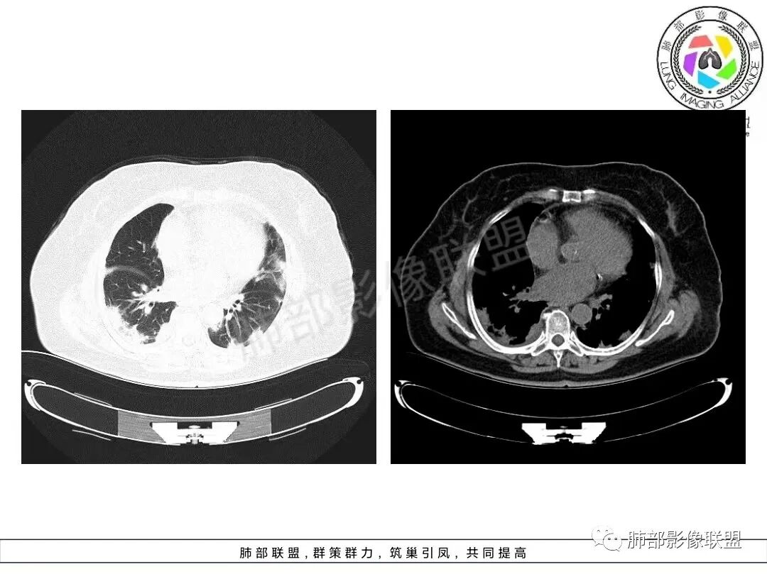 老年女性,咳嗽、咳黄白痰,无发热,化验炎性指标高,右肺胸膜下实变,其内支气管充气、扩张,周围索条,左肺胸膜下多发结节及斑片实变,胸膜下线影,右侧少量胸水,考虑机化性肺炎,鉴别隐球菌、粘液腺癌