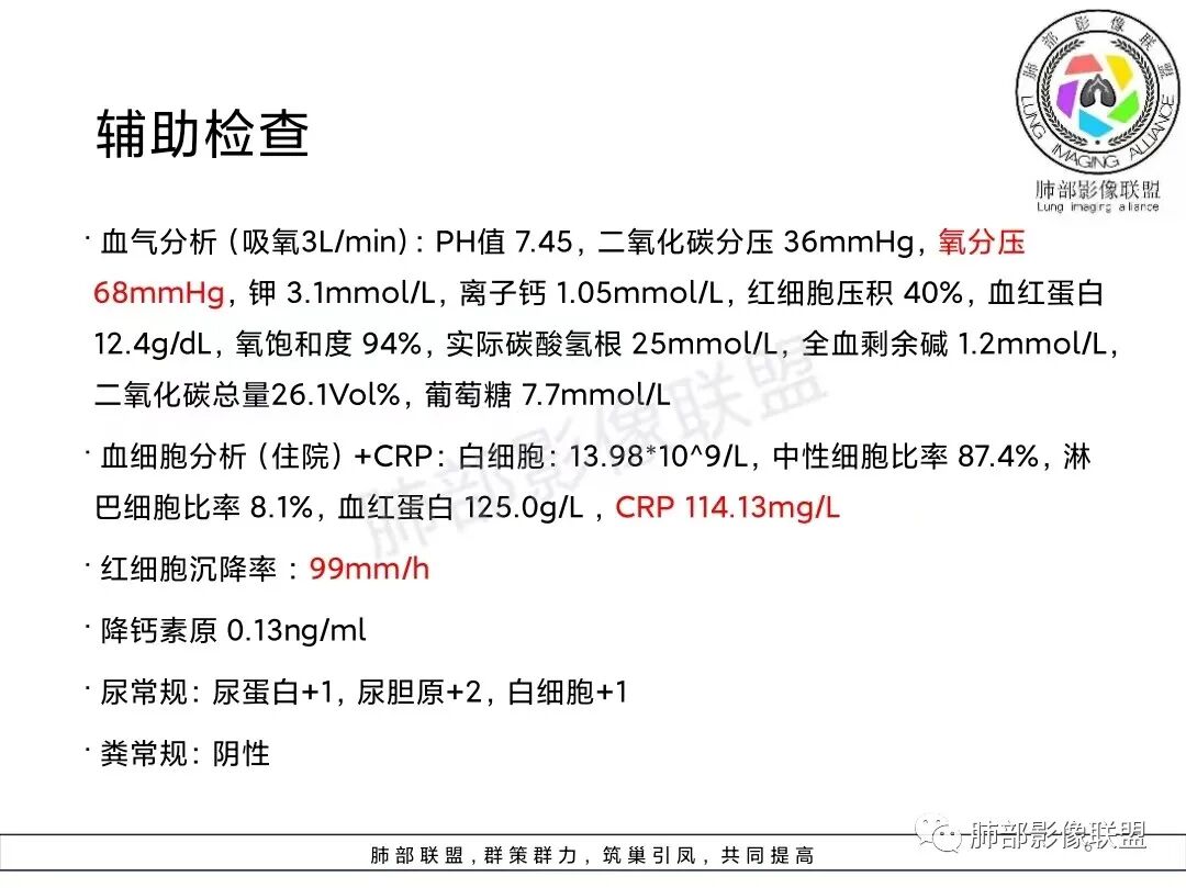 老年女性,咳嗽咳痰伴气急20余天,有皮炎数月,CRP,血沉高,PCT略高,CEA高,血糖稍高,CEA高,缺氧,尿蛋白及尿白细胞高,G试验阳性,GM临界阳性。影像表现:双肺胸膜下为主多发斑片状及结节样实变影,支气管扩张表现为主,部分支气管直达远端,部分中断于实变影中部。影像初步诊断为双肺OP样改变。临床分析:一、感染性疾病1、隐球,亚急性渐进性加重病程,有皮炎史,CRP,血沉高,PCT稍高,GM试验临界阳性都可以支持,影像表现也可以支持。但一般G试验为阴性,此例阳性,加上灌洗液未找到依据,有疑问。需要查隐球荚膜抗原或NGS。2、曲霉,临床表现及G试验和GM试验支持,但影像表现不算典型表现。可能稍小。二、非感染性疾病1、风湿相关性间质性肺炎,双肺胸膜下多发OP样改变,有皮炎史,有尿蛋白增高,灌洗液病原体检测阴性。要考虑,但此患者70多岁,无吸烟史及职业史,亚急性发病,双肺改变以实质受累为主,没有明显的间质受累的细网格表现,也存疑,需要查相关抗体。2、CEP,灌洗液没有提嗜酸情况,除非故意隐瞒,否则不太支持。3、血管炎,有尿蛋白改变,但影像不支持,ANCA阴性也不支持。4、COP,目前依据不是太足。三、肿瘤性病变。肺炎型肺癌,老年女性,CEA增高,加上右肺胸膜下改变,要想到,但分布太广泛,病史太短,没有增强表现,没有以前的老片对照,灌洗液也没有提找到肿瘤细胞,直接诊断还是依据不足。综上,考虑感染性疾病(隐球或曲霉)>风湿相关性结缔组织疾病>肺炎型肺癌(粘液腺)。