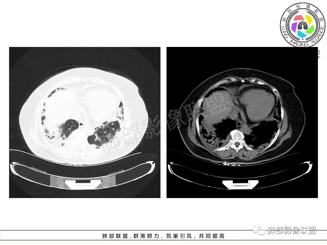 两肺沿胸膜下分布为主,大片、斑片状不均质实变,肺窗>纵隔窗,提示累及肺实质和间质,实变内充气支气管征空洞几乎不见,边缘收缩凹陷,部分平直,肺体积整体未见缩小。临床血氧降低,白细胞升高,考虑OP,COP,鉴别隐球菌,粘液腺癌!