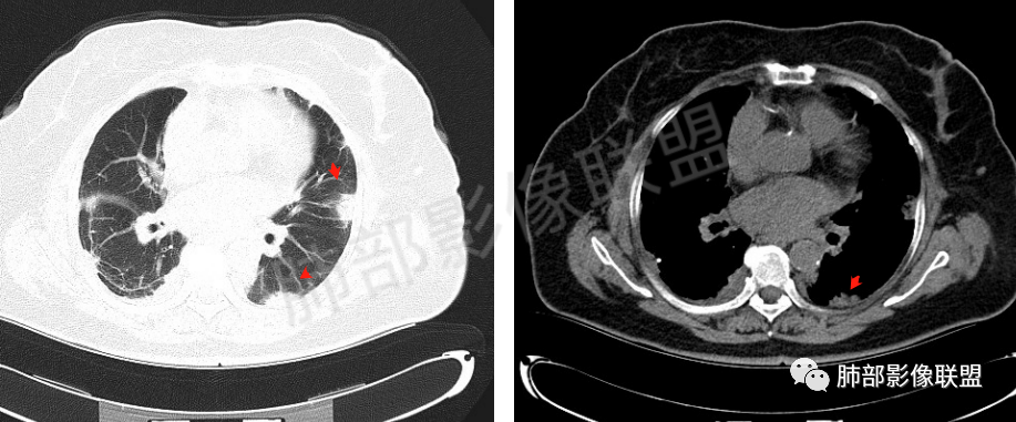 双侧背侧胸膜下大片状、斑片状实变影+GGO,不太对称