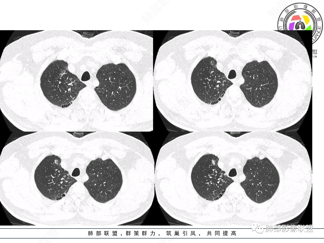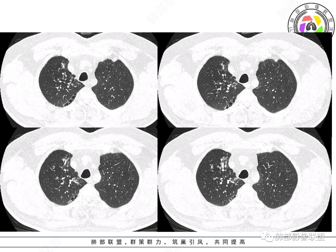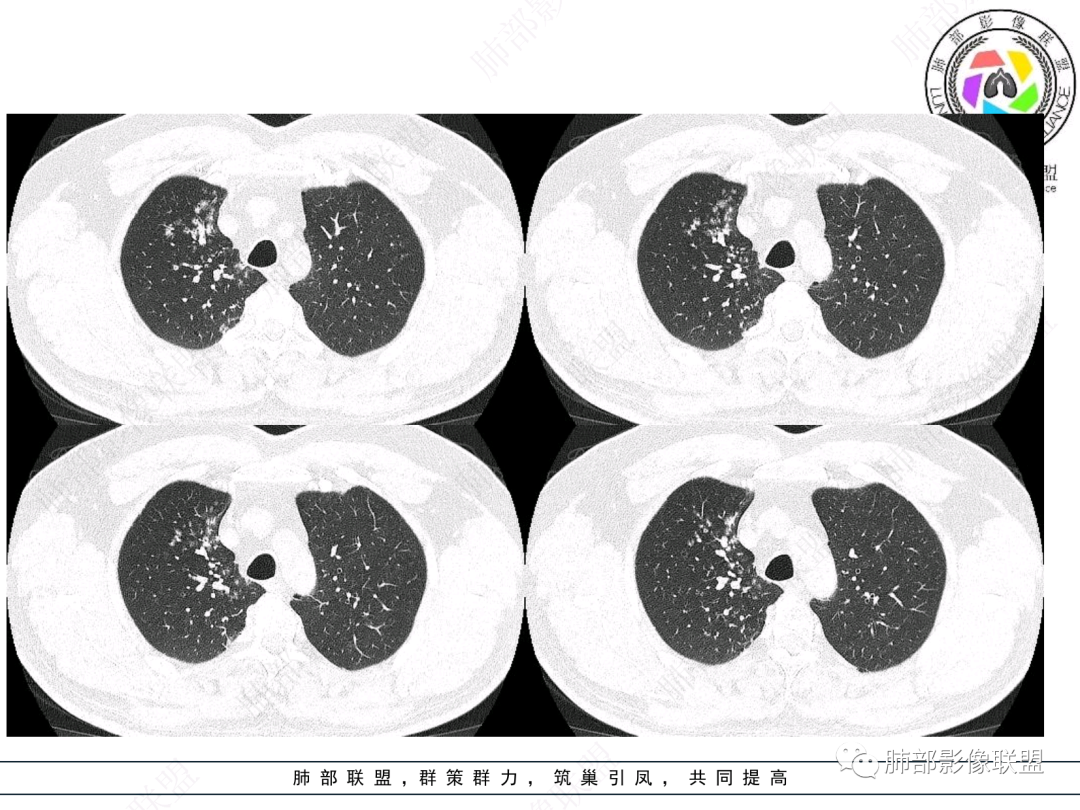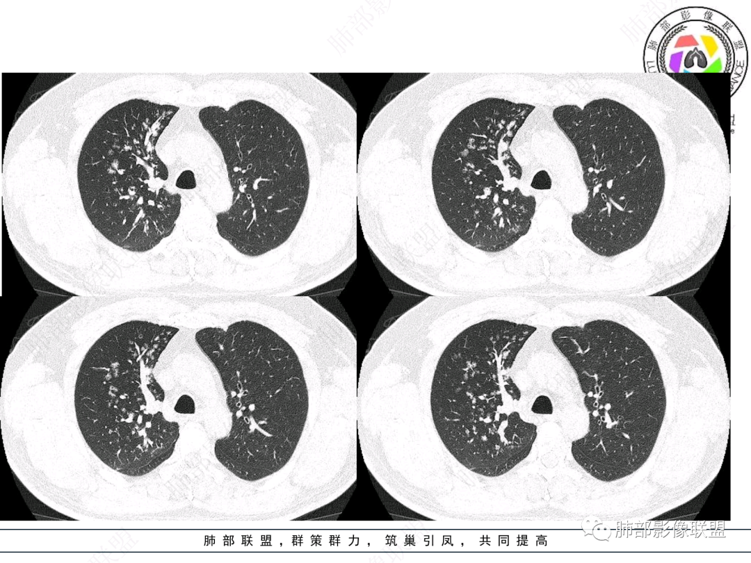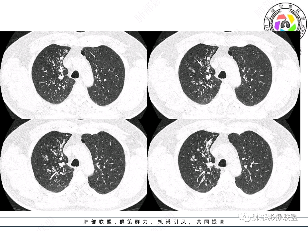 右气管腔内结节,右肺门肿物,有钙化,右侧肺内多发气腔结节,散在,左肺部分支气管壁增厚,首先分析气管内结节,多考虑1鳞癌,形态规则,边缘光滑,宽基底,不太支持,远端阻塞性炎症不典型,2类癌,冰山一角和冰山分离了,不太支持3结核,多为支气管壁广泛增厚钙化,形成结节少,但是肺门肿块有钙化,可作为结核支持点,4黏痰,不像。其他不太懂了,肺内多发磨玻璃结节,并可见支气管手指状扩张,综合分析影像,考虑感染性病变,结核?有没有这样子的气管曲霉呢?向老师们学习。