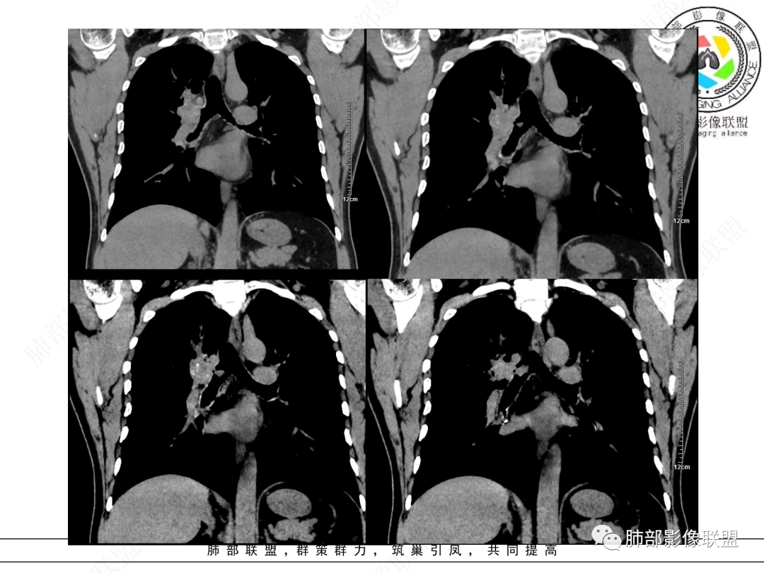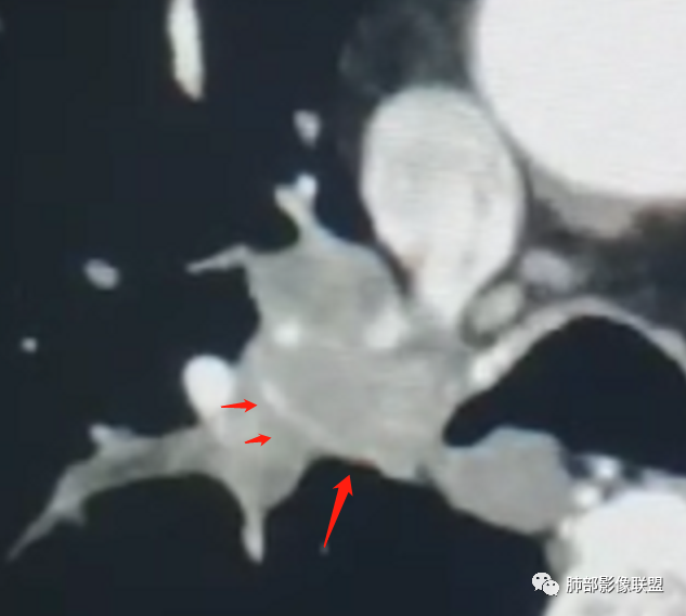 这个病例比较好,我们的观察点在哪?这是右上叶支气管病变,需要了解:腔内、壁、腔外、远端,腔内有软组织密度影,近端膨隆。