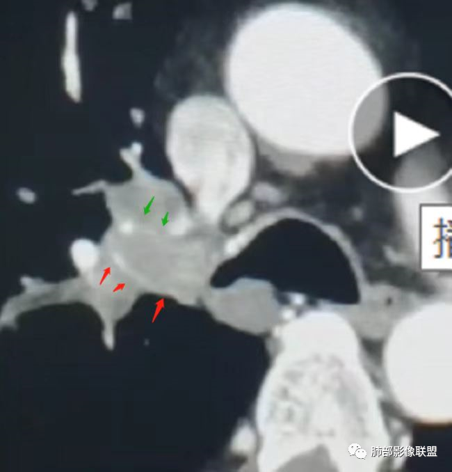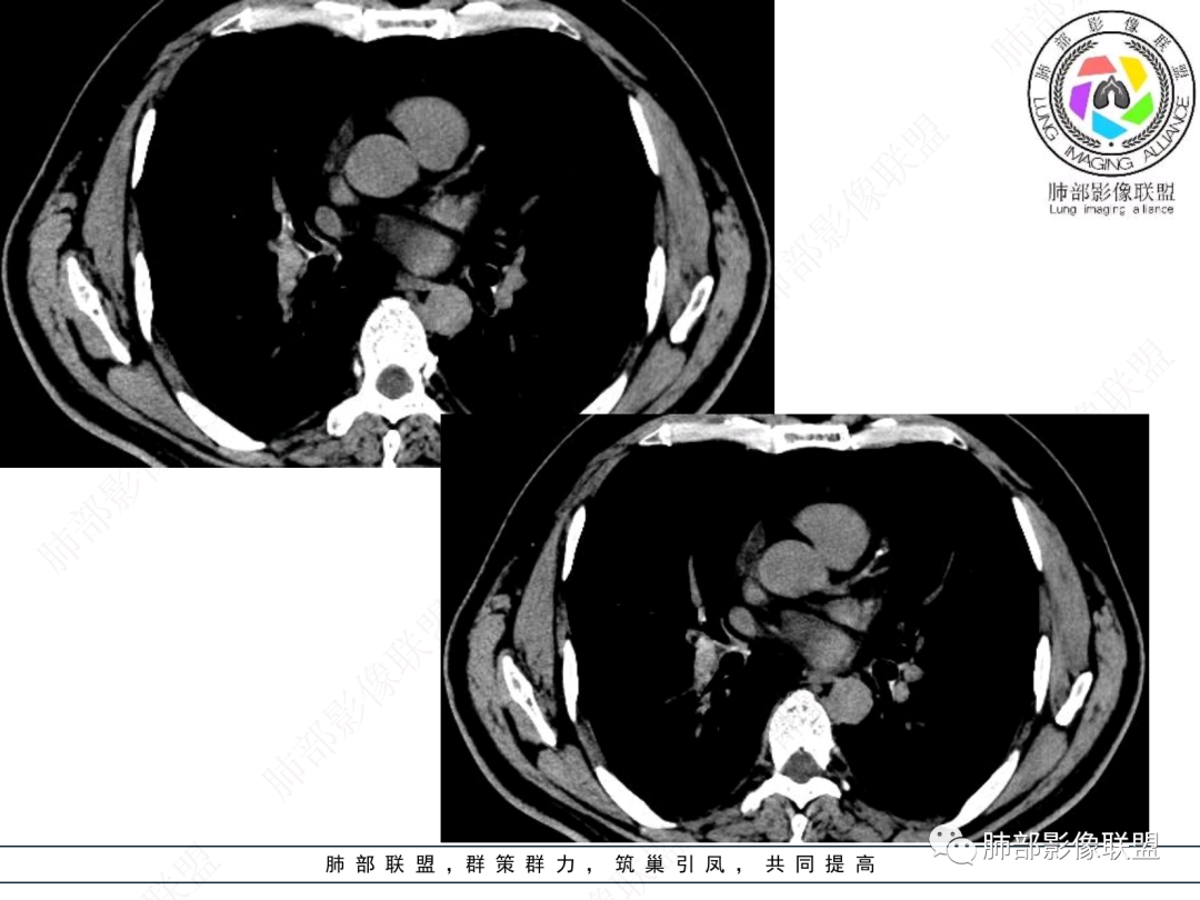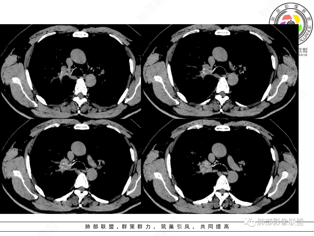 腔内肿物,强化不均匀,强化程度为轻中度强化(CT值增加25HU),且强化特点为快进快出,右肺上叶支气管责任区域的阻塞性炎症加痰栓(气管镜也证实右上叶支气管内痰多)。这些均明确指向鳞癌。