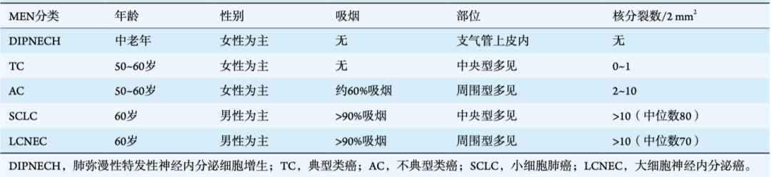2015年,WHO将肺癌组织学分型肺的神经内分泌病变分为良性的神经内分泌细胞增生和微小瘤,以及一系列恶性的神经内分泌肿瘤,这些肺的神经内分泌肿瘤包括低度恶性的TC、中度恶性的AC以及高度恶性的LCNEC和SCLC。