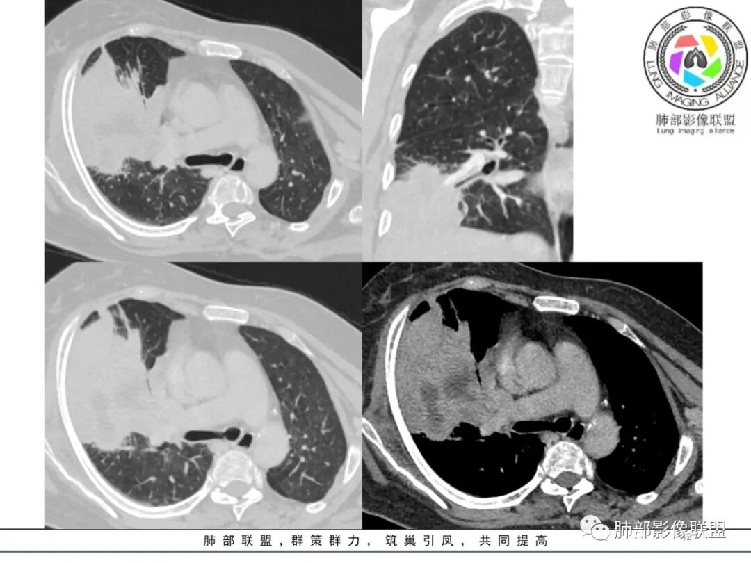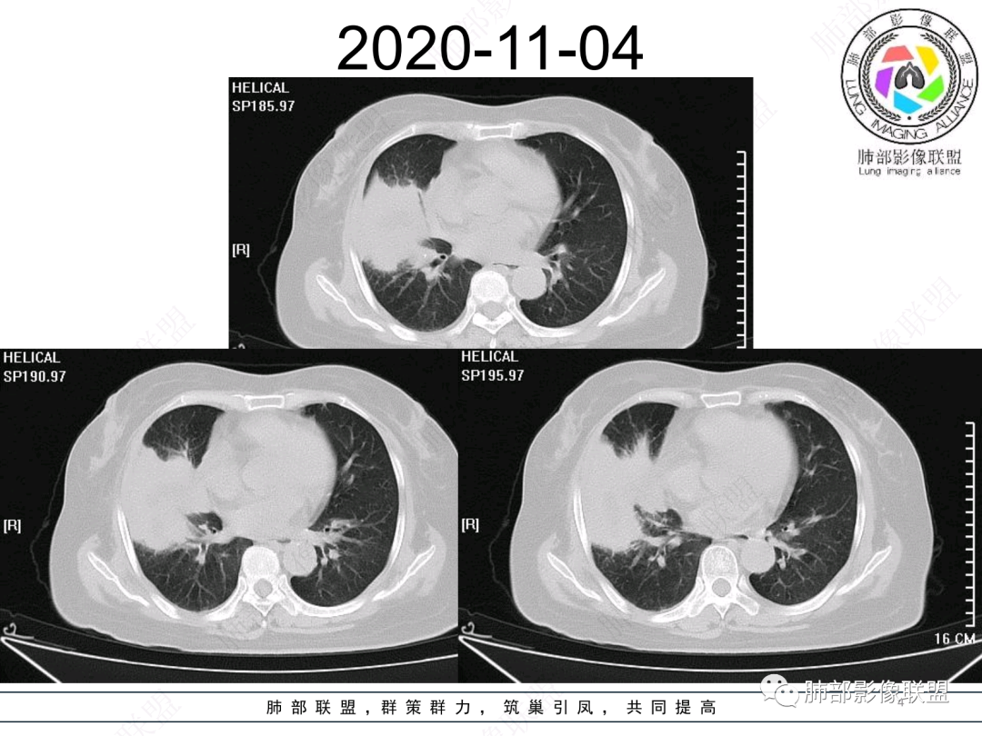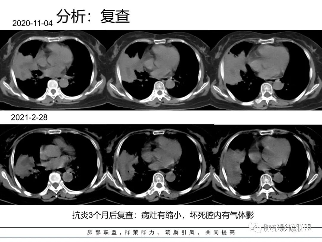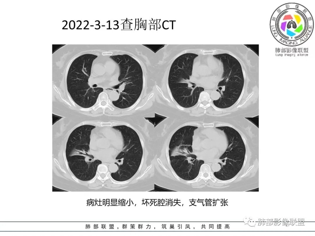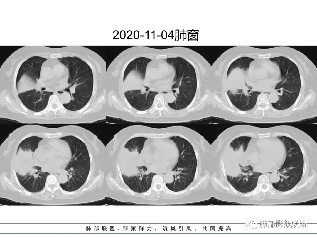 然后中叶与下叶的坏死腔病灶是相通的,病灶是跨叶的,胸膜糊墙为主。