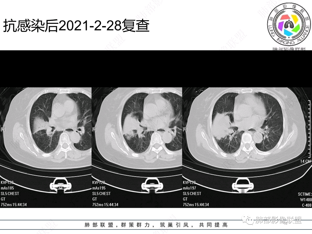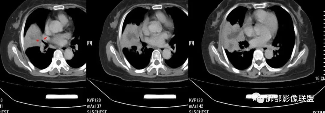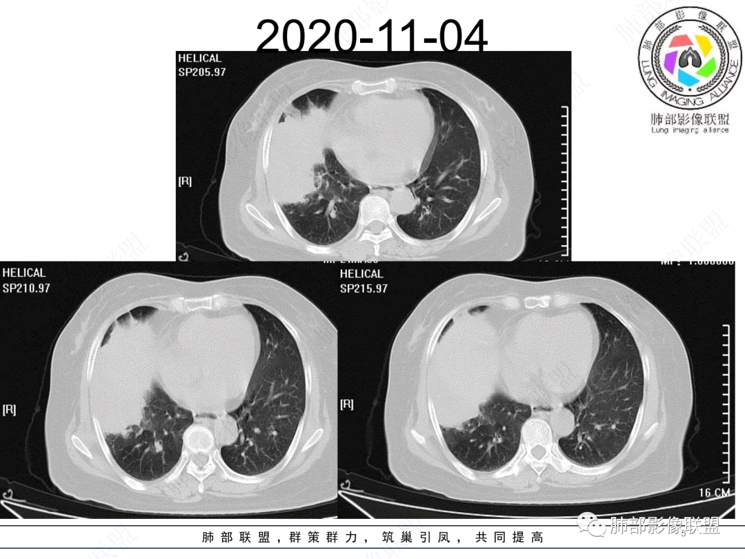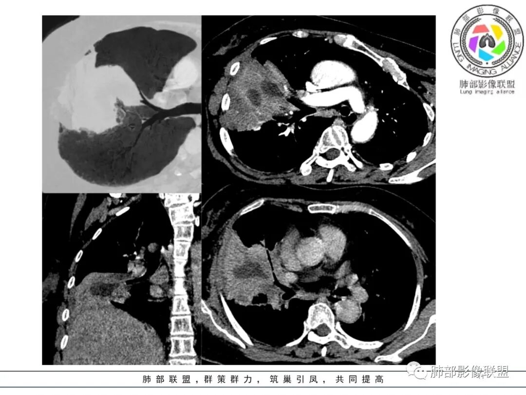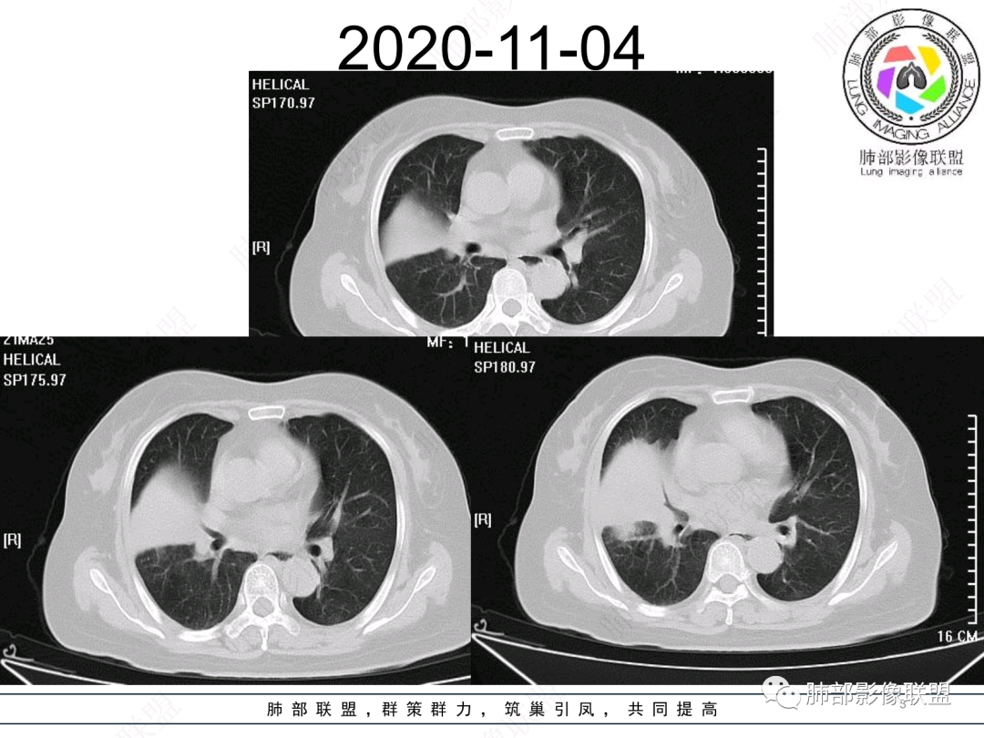 然后中叶与下叶的坏死腔病灶是相通的,病灶是跨叶的,胸膜糊墙为主。