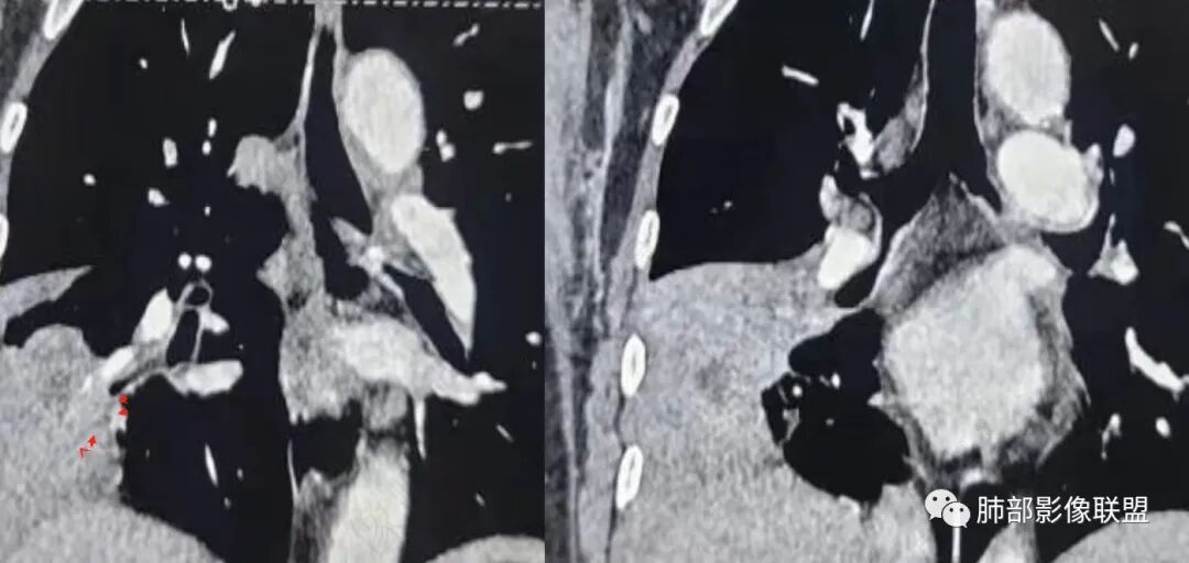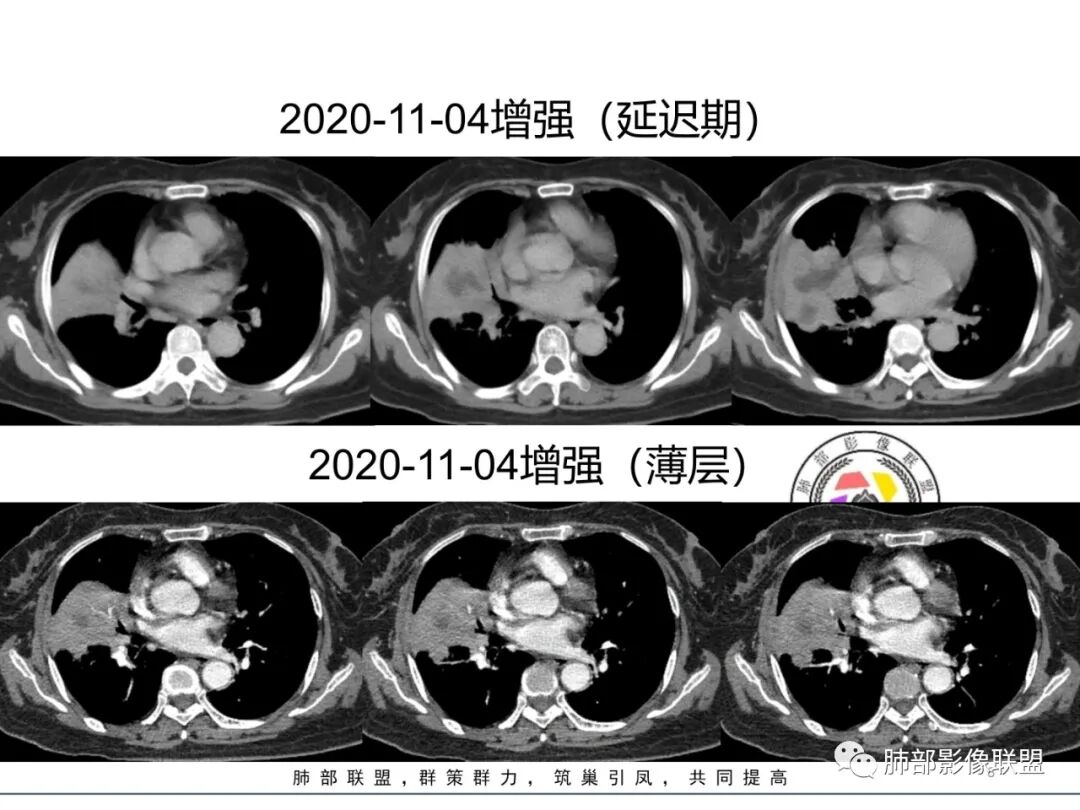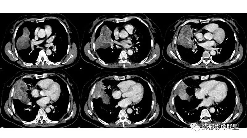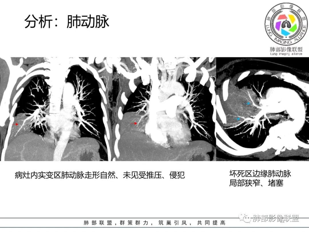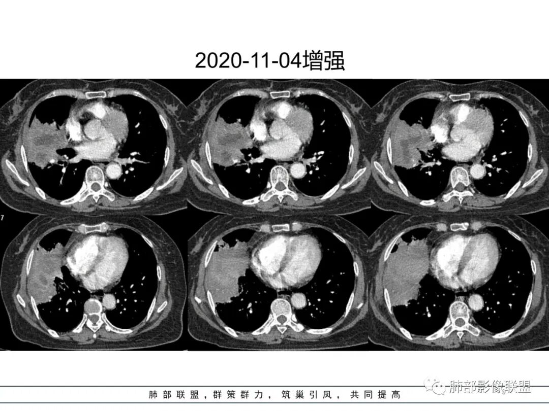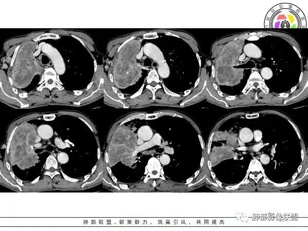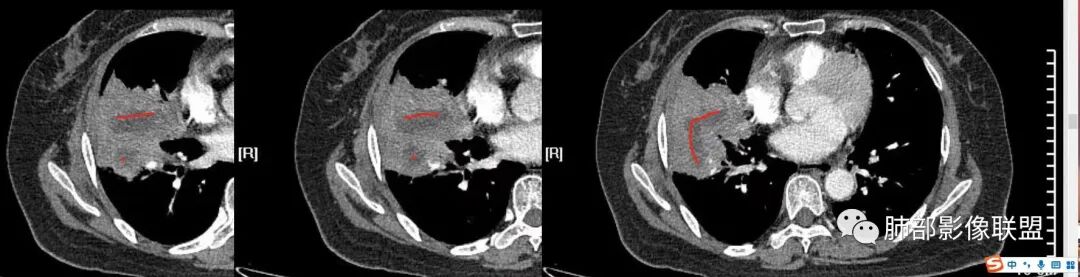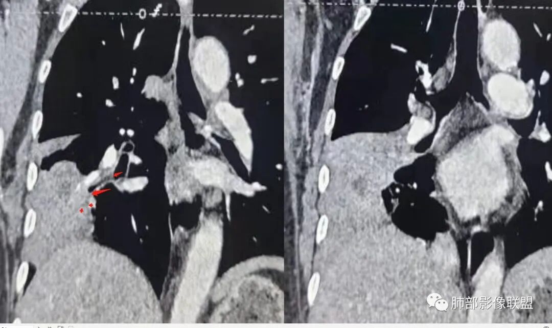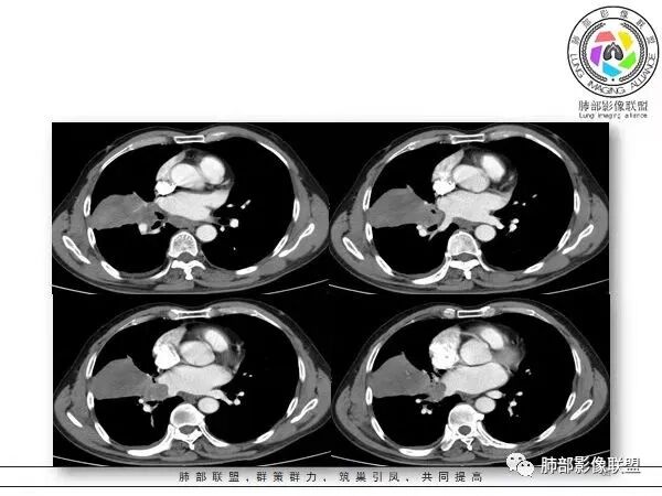 如果是腔内的病变,第一,应该是局限在某个叶的,不可能上下叶都有。所以不太支持腔内的病变。因此考虑腔外的病变。腔外局限的肿瘤肯定不符合,假如这个病灶是个局限大肿块的话,里面肺动脉走势还可以。