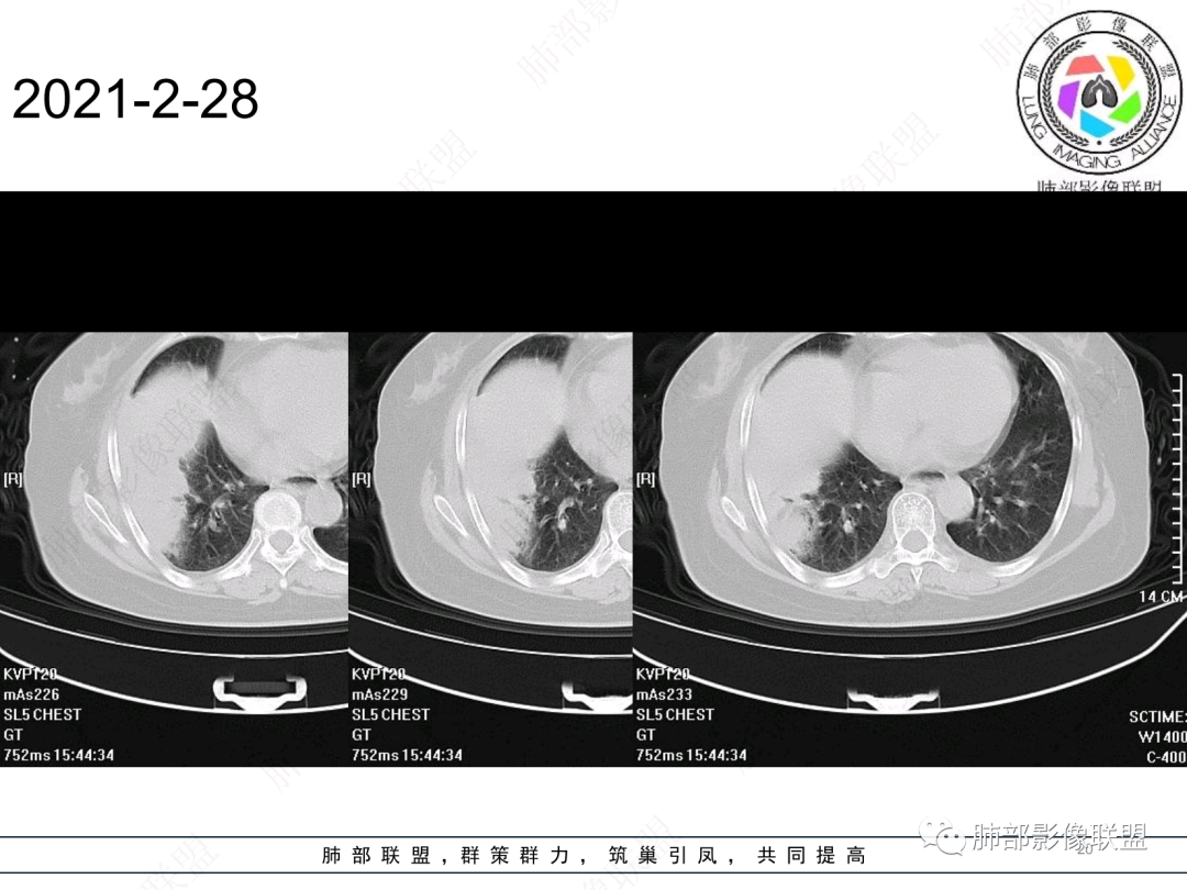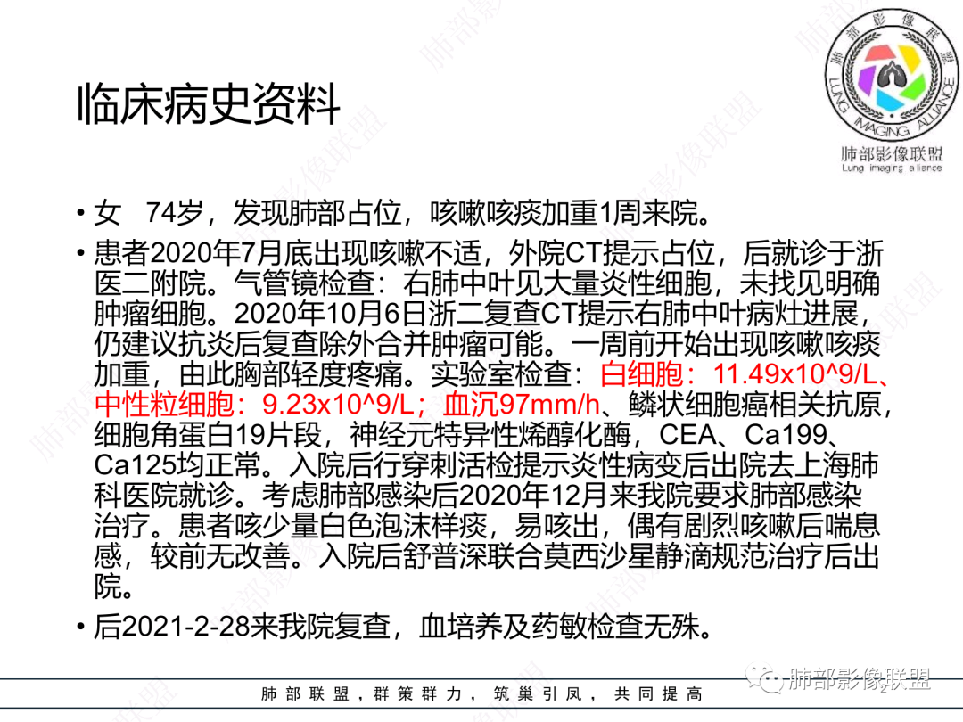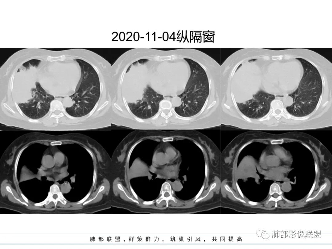 炎瘤pk。老年女,病史很长,炎性指标高,血沉高,瘤标不高,咳粘痰,伴喘息,有胸痛。支气管镜、穿刺两面夹击未查出肿瘤,临床偏感染。影像支持肿瘤征像:1 支气管有截断 但属门口堵,炎性也可 2 坏死境界相对不清 3 斜裂有膨隆,有占位效应 4 胸膜有收缩 5 部分层面有胸膜外浸润? 支持炎性证据: 1 前三月病史说中叶有进展 , 后近四月中叶未进展,甚至有缩小 。2 病灶跨裂蔓延 累及下叶 ,与中叶此起彼伏? 3支气管镜、穿刺两面夹击未查出肿瘤,支气管镜做的太早? 综合 感染性病变可能大,病原菌难猜,但肯定与耐抗生素或抗生素无效病原体,抗酸杆菌类,真菌类 、耐药菌可能。