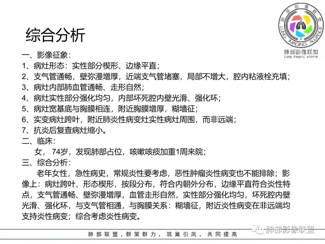 老年女性,慢性病史,炎性指标稍高,肿标正常,右中下肺大片实变,跨叶生长,边界清,收缩力差,膨隆生长为主,支气管杵状截断,均匀强化,其内坏死边界清,可见悬浮气泡,整体观察,病灶膨隆生长为主,邻近肺野无播散灶,形态单一,尽管慢性病史,影像不支持OP和TB,支气管截断呈杵状,肿标正常,均匀强化,虽是高龄患者,诊断恶性肿瘤有点牵强,综和分析,首选炎性病变放线菌感染,其次考虑低度恶性占位炎机母。