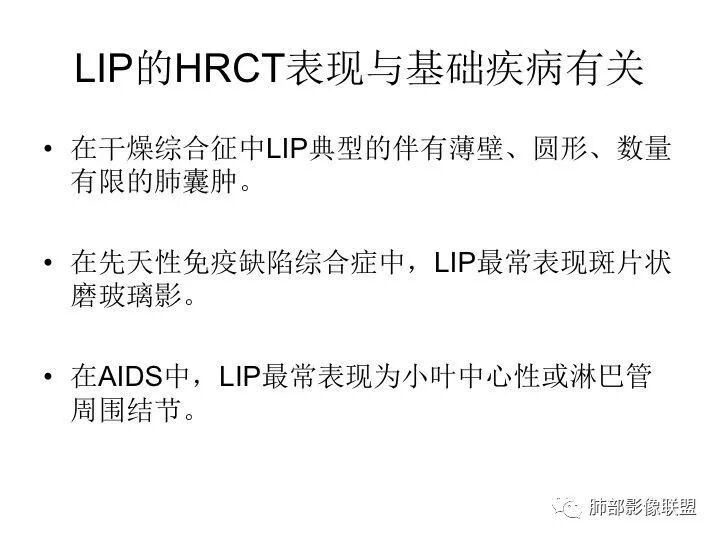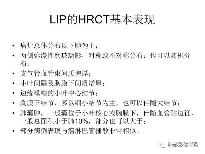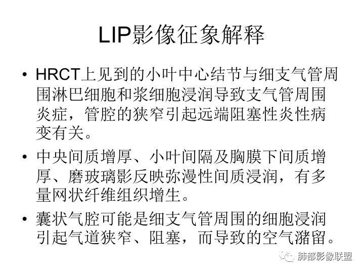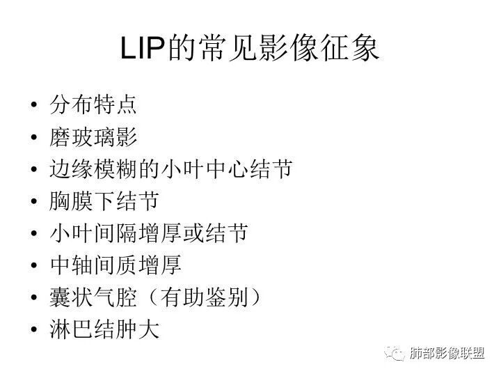 LIP:小叶中心囊+结节+间质改变;如果实变病灶较多,警惕淋巴瘤