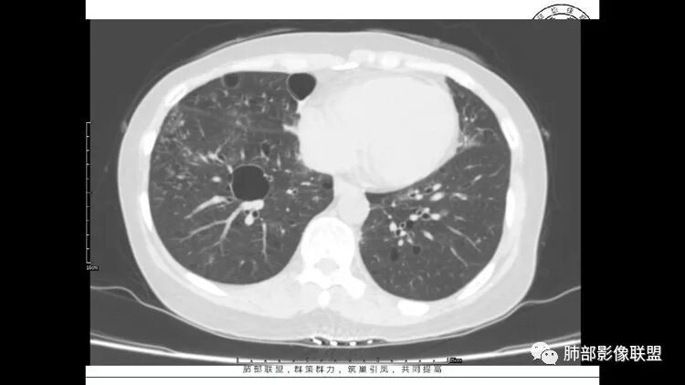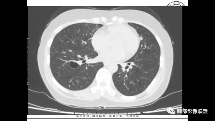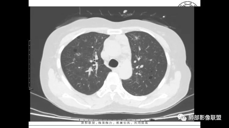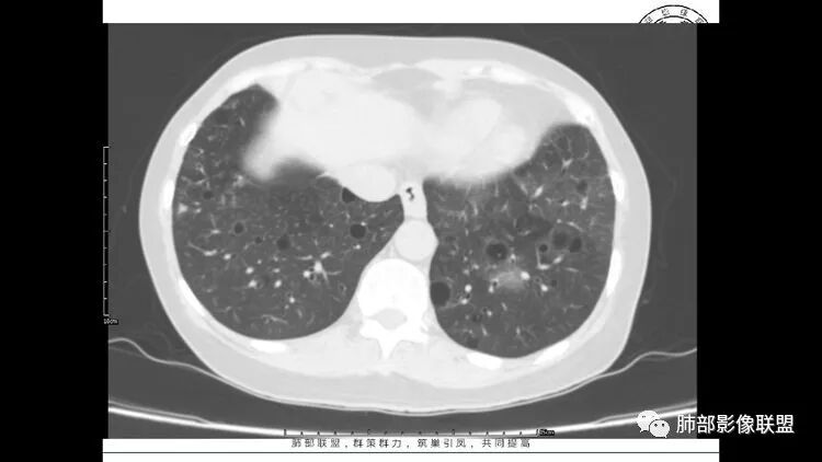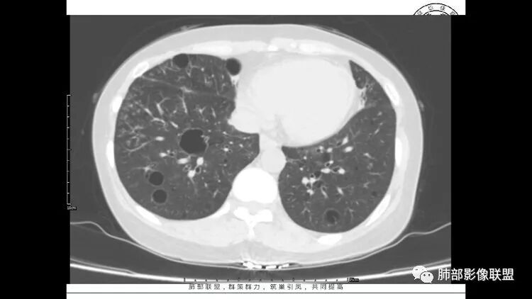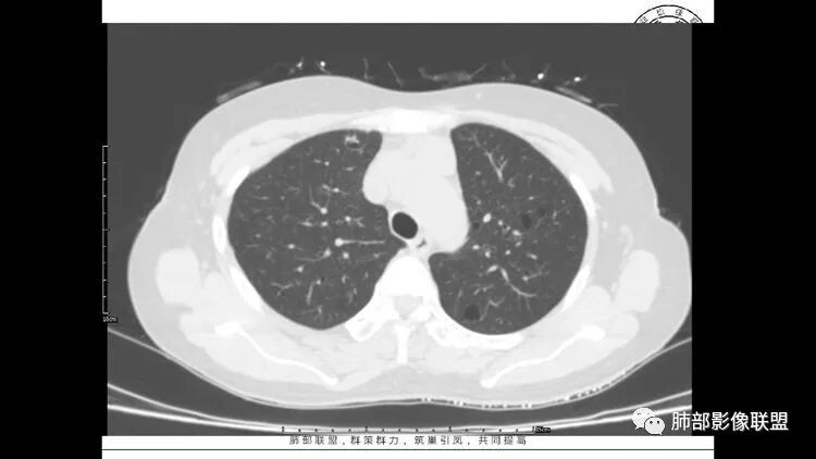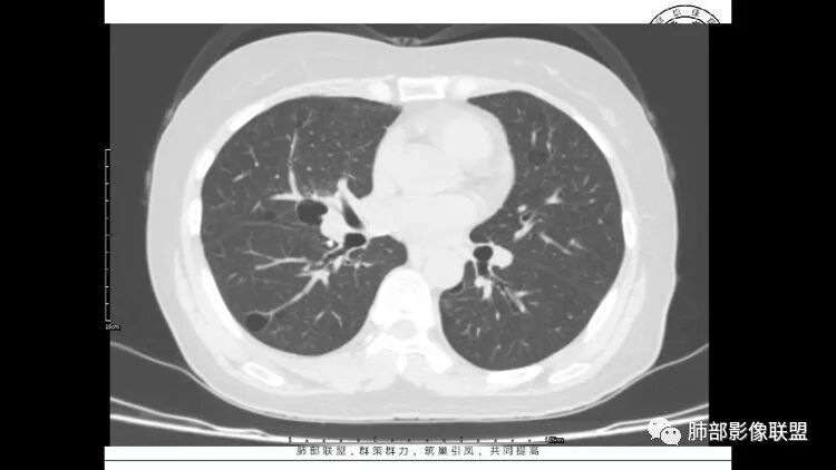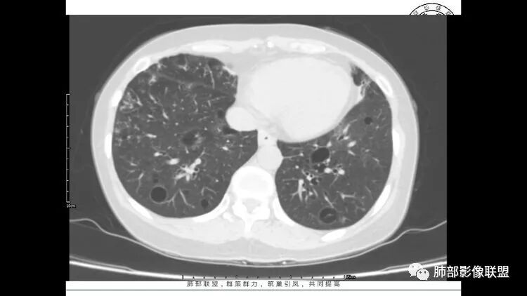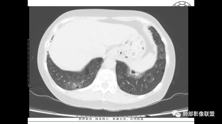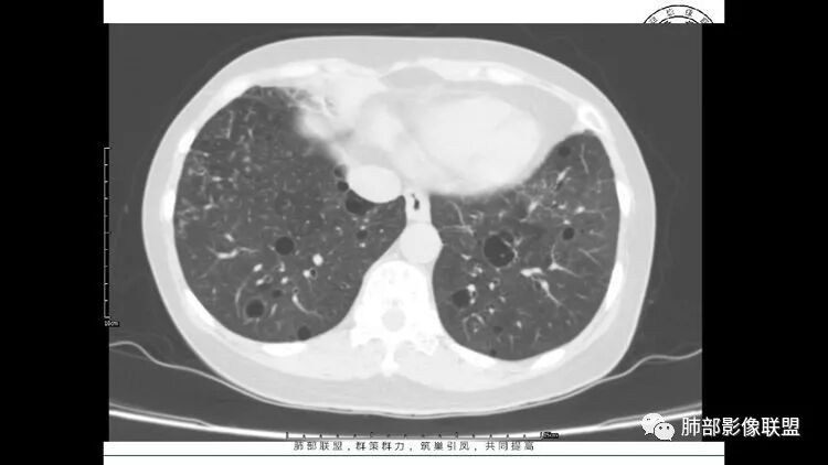 胸CT:1.双肺多发囊性变,以中下肺为主,病变边缘可见肺动脉,部分囊内可见分隔及肺动脉,双下部分肺野周围可见小叶中心结节及树丫征。