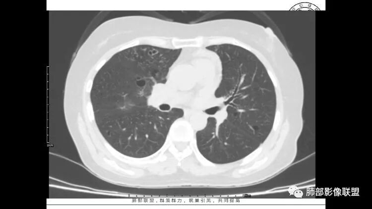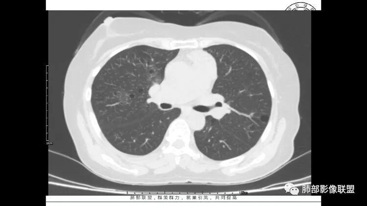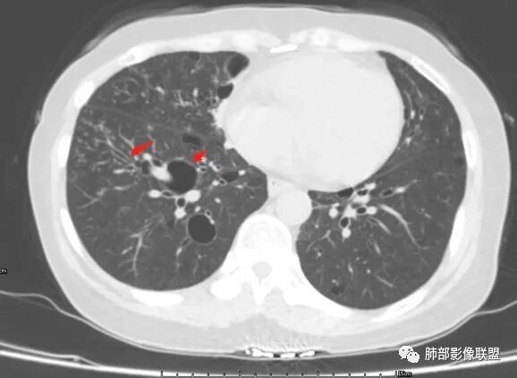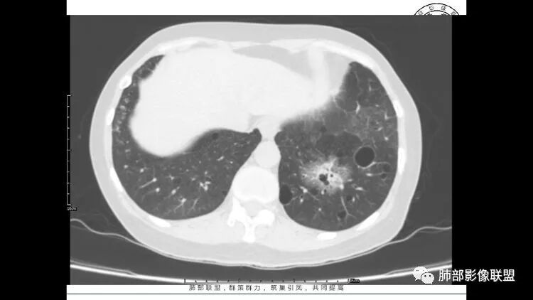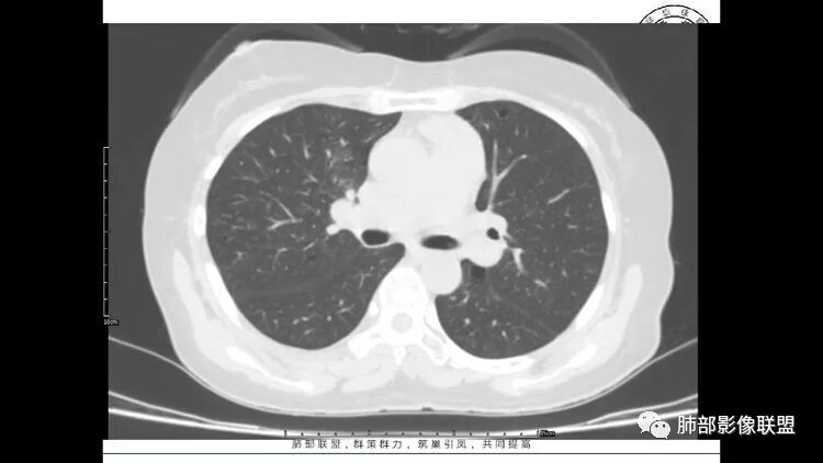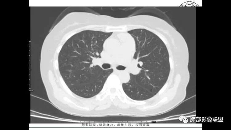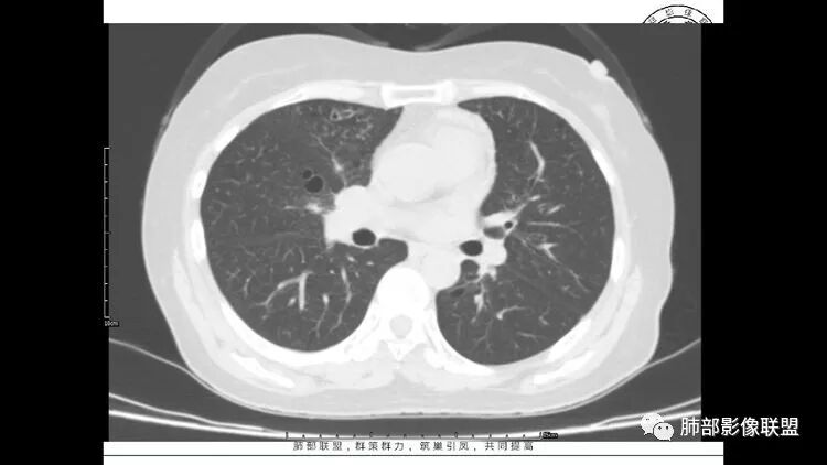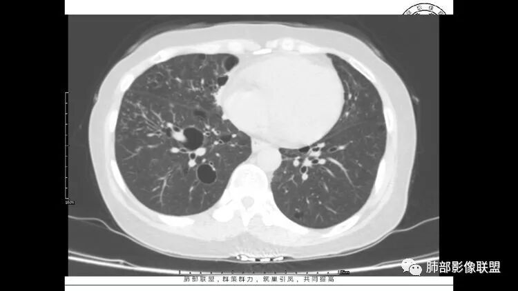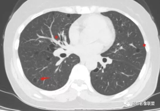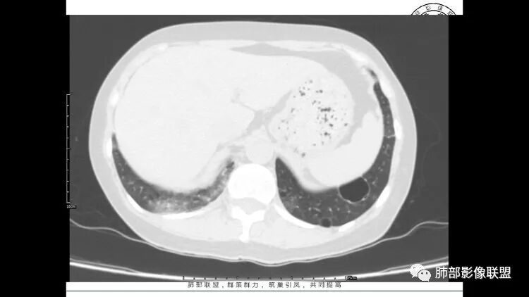 胸CT:1.双肺多发囊性变,以中下肺为主,病变边缘可见肺动脉,部分囊内可见分隔及肺动脉,双下部分肺野周围可见小叶中心结节及树丫征。
