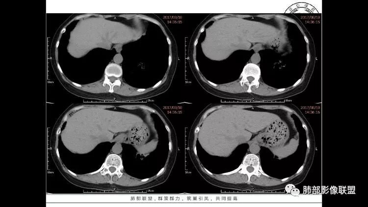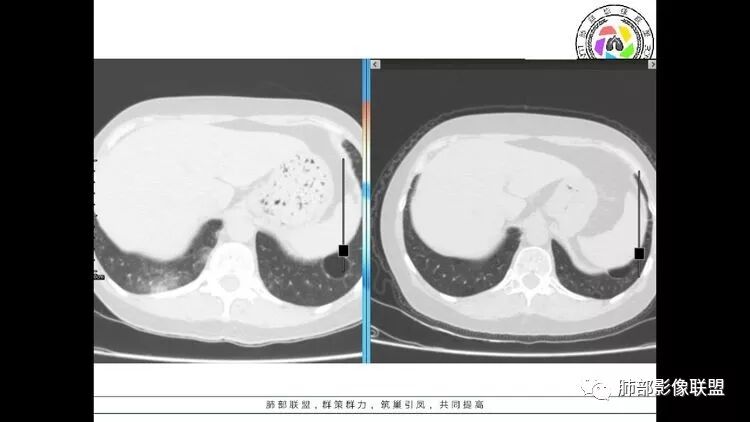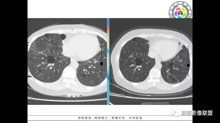 多发气囊,气囊内可见血管进入,因患者眼干伴类风湿,可能有干燥综合征,那LIP可能性大。因为不是育龄期发病,可排除LAM。患者左纵膈淋巴结肿大,且有融合趋势,结合左下肺病灶,考虑合并恶性肿瘤,淋巴瘤?鉴别结节病