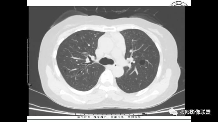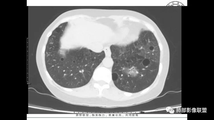 中年女性,双肺多发囊性变,以中下肺为主,病变边缘可见肺动脉,部分囊内可见分隔及肺动脉,左肺上叶较大结节,可见分叶、月牙铲,左肺下叶、右肺中叶磨玻璃病灶,边界清楚,内有空泡,结节,可见尖后段 右肺上叶前段 右肺下叶外基底段 结节影,边界清楚,纵隔淋巴结肿大,