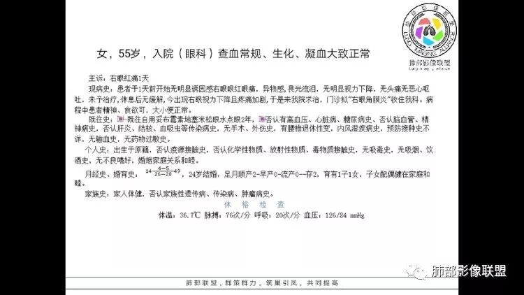 考虑:淋巴瘤肺浸润,眼部症状考虑与此有关;LIP?;继续鉴别肺腺癌?血管炎?。