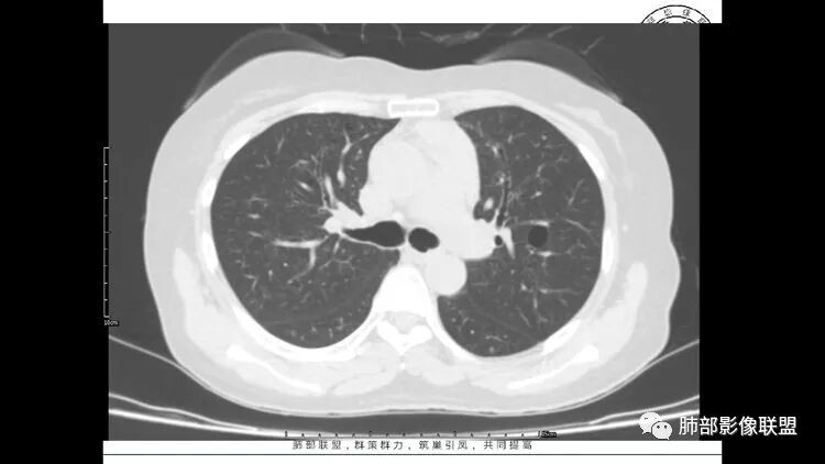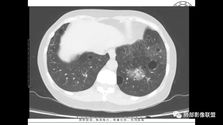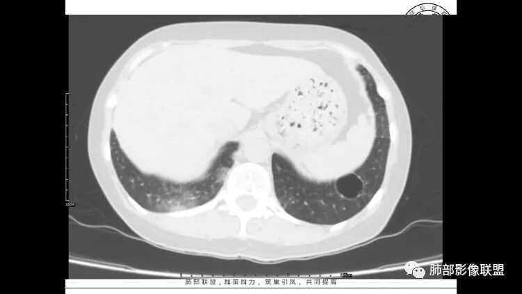 老年女性,眼炎入院,血常规正常,双肺多发囊状影,病变随机分布,形态单一,与血管关系密切,考虑LIP。左下肺混合GGO,边界尚清,贴近囊腔,鉴别腺癌。炎症指标无异常暂不考虑感染性病变。