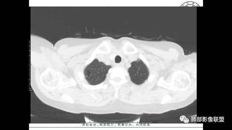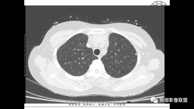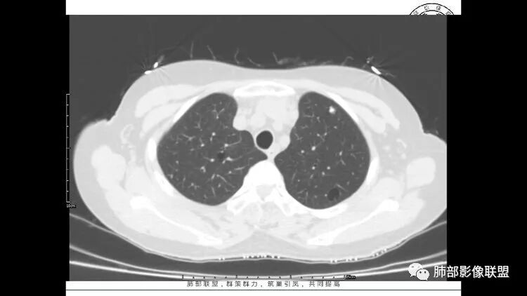 双肺多发囊性变及结节影,囊壁光滑,结节部分为实性,边缘清,未见明显毛刺、胸膜牵拉及血管集束征象。双中下可见树芽。考虑淋巴细胞间质性肺炎,鉴别肺癌恶性病变。