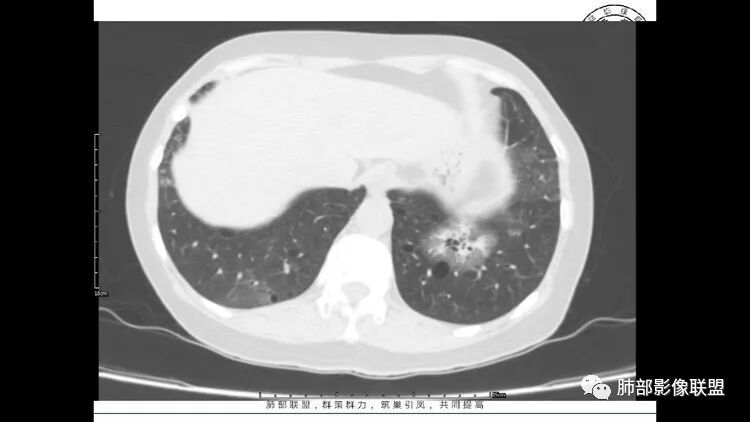 左肺下叶混杂密度病灶,其内可见空泡,周围ggo清楚,考虑浸润性腺癌。双肺散在多发薄壁囊腔和实性结节,以胸膜下及血管旁分布位于,气囊可见血管贴边征,双肺小叶间隔及中央间质增厚,局部可见磨玻璃影及树芽征,纵隔内淋巴结肿大,考虑LIP