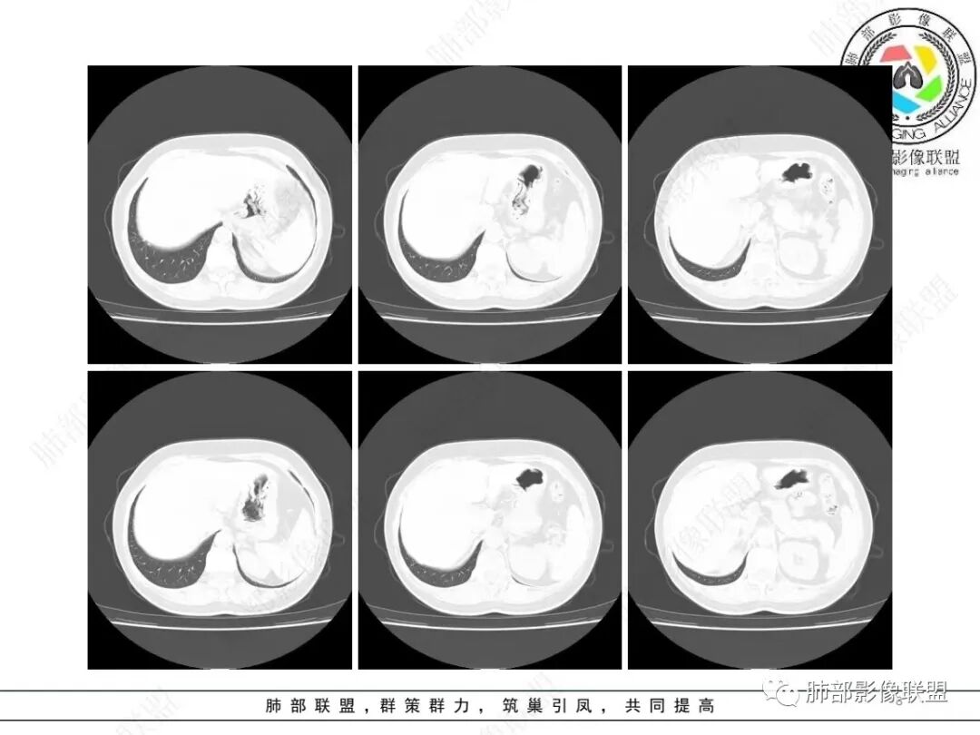 2、影像特点:右肺下叶胸膜下不规则结节,矢状位整体病灶沿着支气管方向呈斑片状,不均匀强化。病灶边缘多平直、凹陷(从部分层面可见极其像月牙铲),缺乏膨隆感,周围可见多发长索条影,病灶内可见多发充气支气管影,大部分支气管完全贯通病灶并轻度扩张,极少支气管进入病灶内堵塞,观察横断位视频、部分层面病灶周围可见边界欠清的ggo。纵隔窗病灶内未见明显钙化影。未见卫星病灶及树芽征。