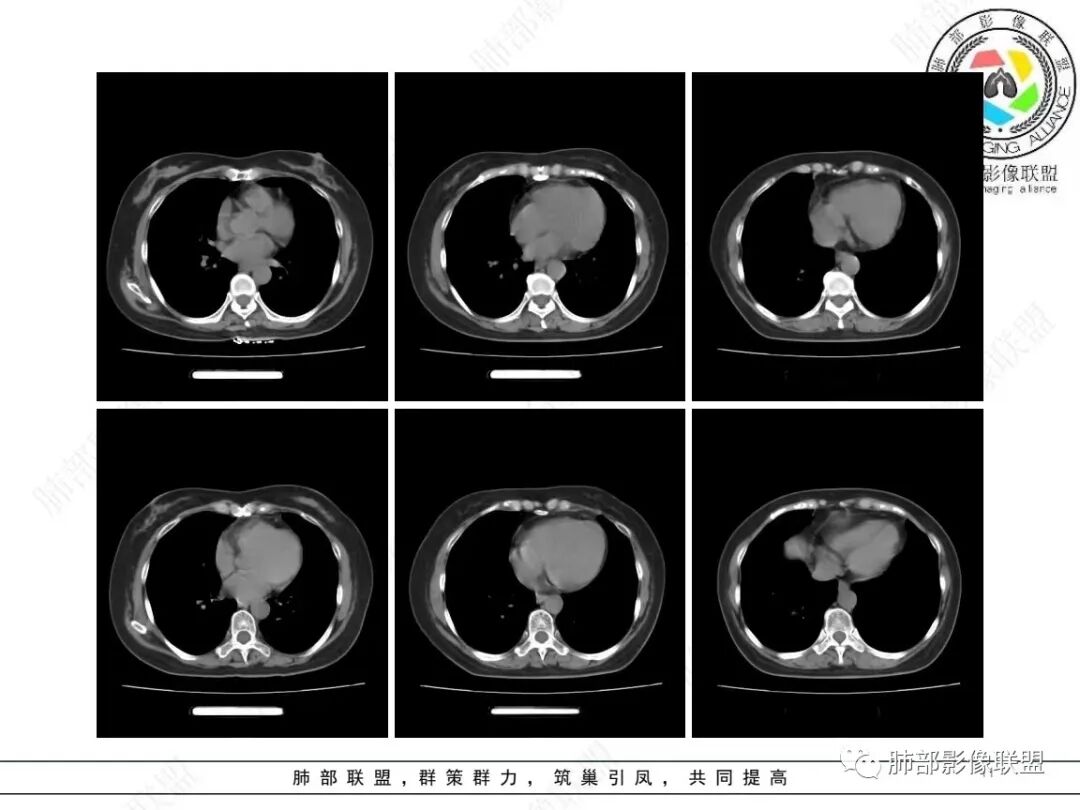 中年女性,右肺下叶不规则团片影,边缘不清,感觉较散,内见支气管通过,增强明显强化。