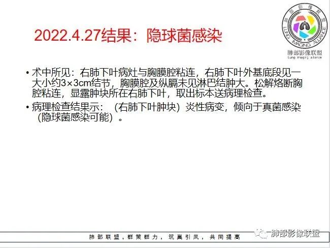 这个病例从病史方面看是体检发现的,而且她的炎症指标都不高,那么我们临床上这种体检发现的肺部的这种结节性病变,肯定会考虑是感染还是肿瘤,这种情况下,一般情况下,我喜欢收住院,然后一边抗感染,一边进行辅助检查,那么,感染性的考虑肉芽肿性炎。,结核,真菌,特别是隐球菌,可能要放在首位,因为这个病灶周边有晕,而且在胸膜下,结节看上去好像是多个结节聚集融合形成的。所以住院之后很可能就进行结核,隐球,真菌等方面检查,再就是肿瘤方面的检查肯定也进行了,短期抗炎治疗进行复查,复查之后那么这个病灶有没有变化?怎么样变化的,为下一步可能就提供方向了。大部分病号的心理素质并不是那么高,所以说很多病号加上医生就选择了手术这个方法了,因为手术除了诊断之外,它还可以直接进行治疗,到底是李鬼还是李逵?切完之后送病理,一切就真相大白了,那么,从这个胸部CT片的表现看的话,右下肺的这么偏实性的结节,周边有晕。而且病灶收缩为主,就像一种兵器月牙铲,周边应该是有血管集束症的。病灶的中间好多那种蜂窝状的支气管的那种扩张应该是。好像还有一点胸膜凹陷征。从这些征像上来看的话,恶性的可能性比较大,具体是腺癌啊,还是别的什么肿瘤?单纯从影像学上来说的话,很难去确定。所以我觉得给一个临床的大致方向,然后进一步去检查治疗,可能就可以了。